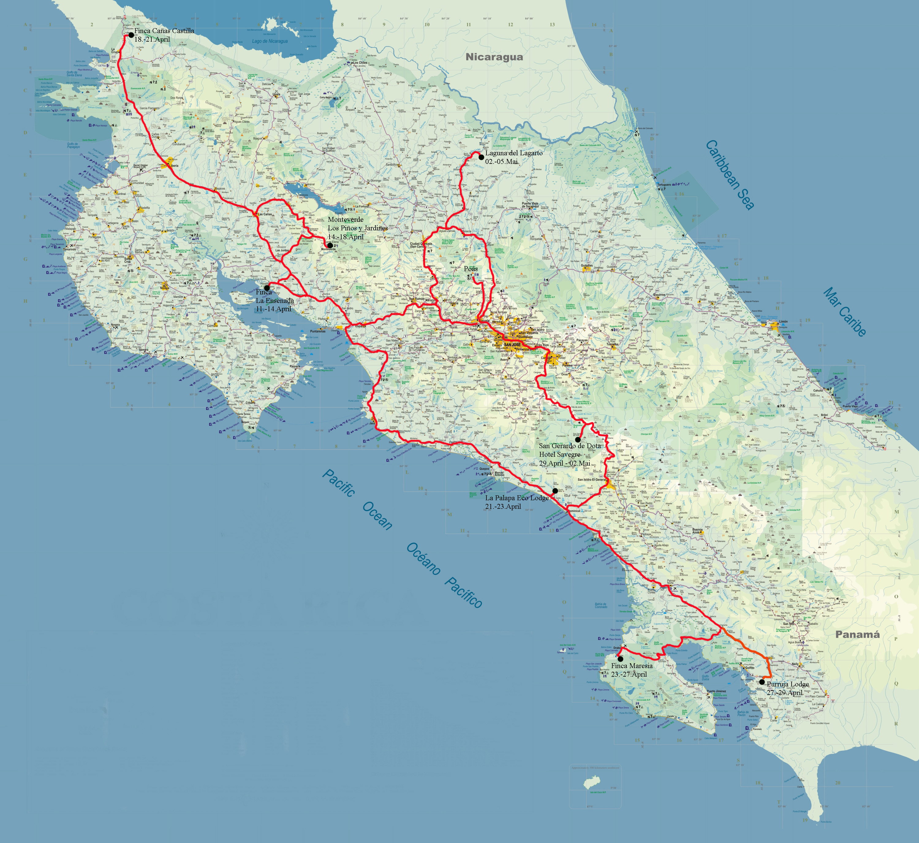 10.04. Stuttgart - Atlanta - San José 11.04. San José - La Ensenada Lodge 12.04. La Ensenada Lodge 13.04. La Ensenada Lodge 14.04. La Ensenada Lodge - Monteverde 15.04. Monteverde 16.04. Monteverde 17.04. Monteverde 18.04. Monteverde - Cañas Castilla 19.04. Cañas Castilla 20.04. Cañas Castilla 21.04. Cañas Castilla - La Palapa EcoLodge 22.04. La Palapa EcoLodge 23.04. La Palapa EcoLodge - Finca Maresia (Drake Bay) 24.04. Finca Maresia (Drake Bay) 25.04. Finca Maresia (Drake Bay) 26.04. Finca Maresia (Sirena, Corcovado NP) 27.04. Finca Maresia (Drake Bay) - Golfito 28.04. Golfito (Purruja Lodge) 29.04. Golfito - San Gerardo de Dota (Hotel Savegre) 30.04. San Gerardo de Dota (Hotel Savegre) 01.05. San Gerardo de Dota (Hotel Savegre) 02.05. San Gerardo de Dota - Laguna del Lagarto 03.05. Laguna del Lagarto 04.05. Laguna del Lagarto 05.05. Laguna del Lagarto - Alajuela 06.05. Alajuela Vulkan Poás 07.05. San José - Atlanta - Stuttgart