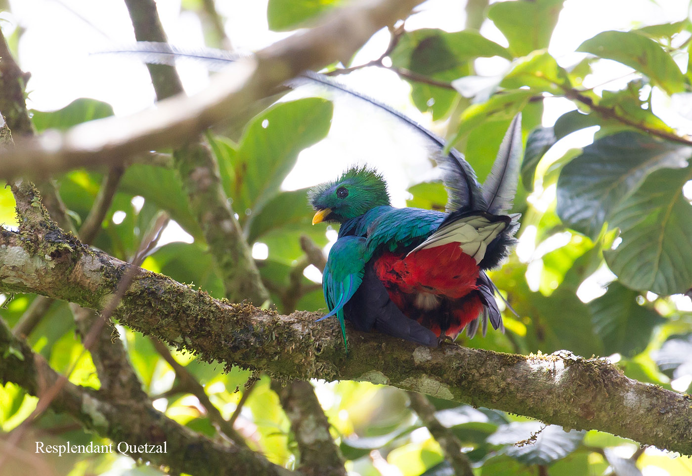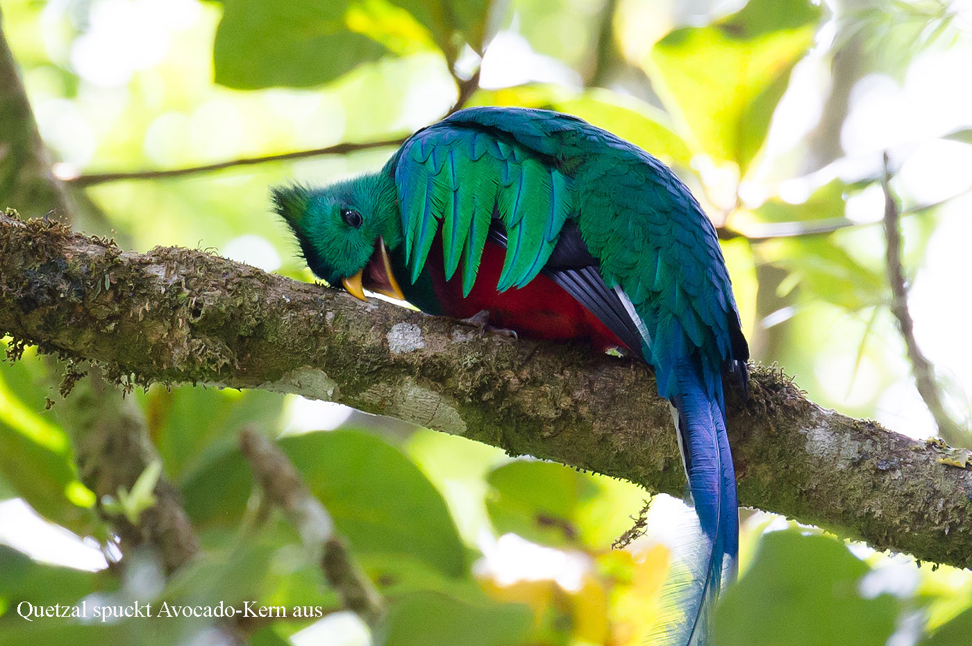 Irgendwann dachten wir nach gut 3 Stunden, dass wir heute wohl kein Glück haben werden und machten uns auf den Rückweg. Kaum waren wir losmarschiert, als ein netter Führer, mit dem wir uns schon vorher ausgiebig unterhalten hatten, uns zurückrief. Tatsächlich war soeben ein prächtiger männlicher Quetzal im Baum gelandet. Ein deutsches Paar, das vorhin auch eine ganze Weile mit uns gewartet hatte und mit uns zurückgehen wollte, war auch begeistert, dass wir noch dieses Glück hatten. Wir schauten lange und ausgiebig und Tomoko fotografierte fleißig. Das gibt sicher wieder 200 neue Fotos für mich zum Bearbeiten, mal sehen... |