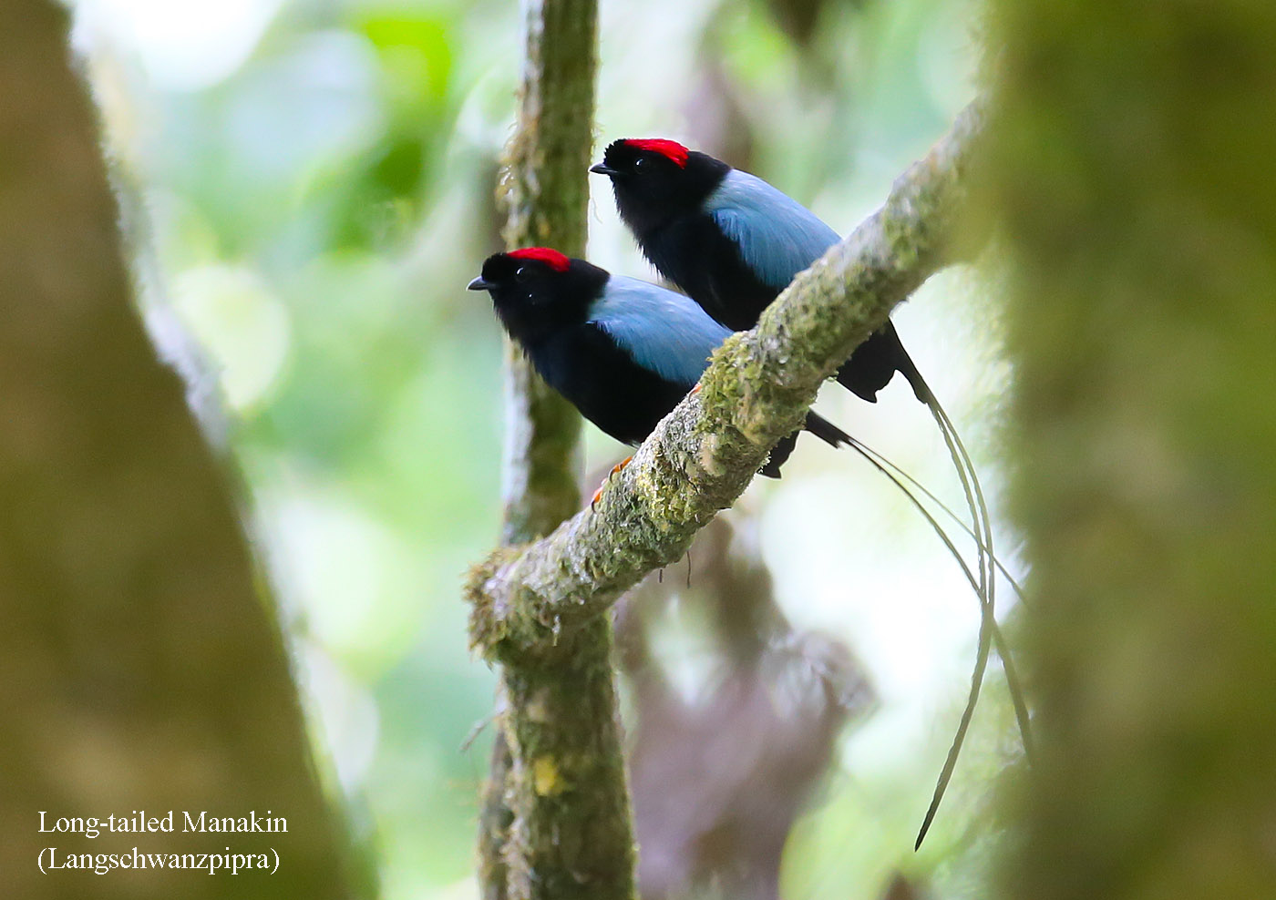 Schon von weitem hörten wir einige Manakins rufen, die wir dann auch bald an der Stelle fanden, wo wir sie schon gestern beobachtet hatten. Hier warteten wir eine Weile und machten einige Fotos. Da wir den Ruf des Bellbirds aus einiger Entfernung hörten, gingen wir nach kurzer Zeit weiter. Wir kamen der Stelle sehr nah, aber so angestrengt wie wir auch mit dem Fernglas die Äste der Bäume absuchten, den Vogel bekamen wir diesmal nicht zu Gesicht, obwohl er immer wieder seinen charakteristischen Ruf erschallen ließ. Wir gingen wieder zu den Manakins zurück. Hier machte Tomoko noch ein paar wunderschöne Fotos. |