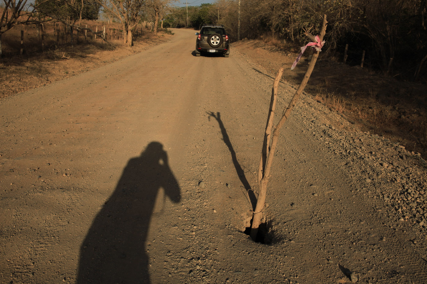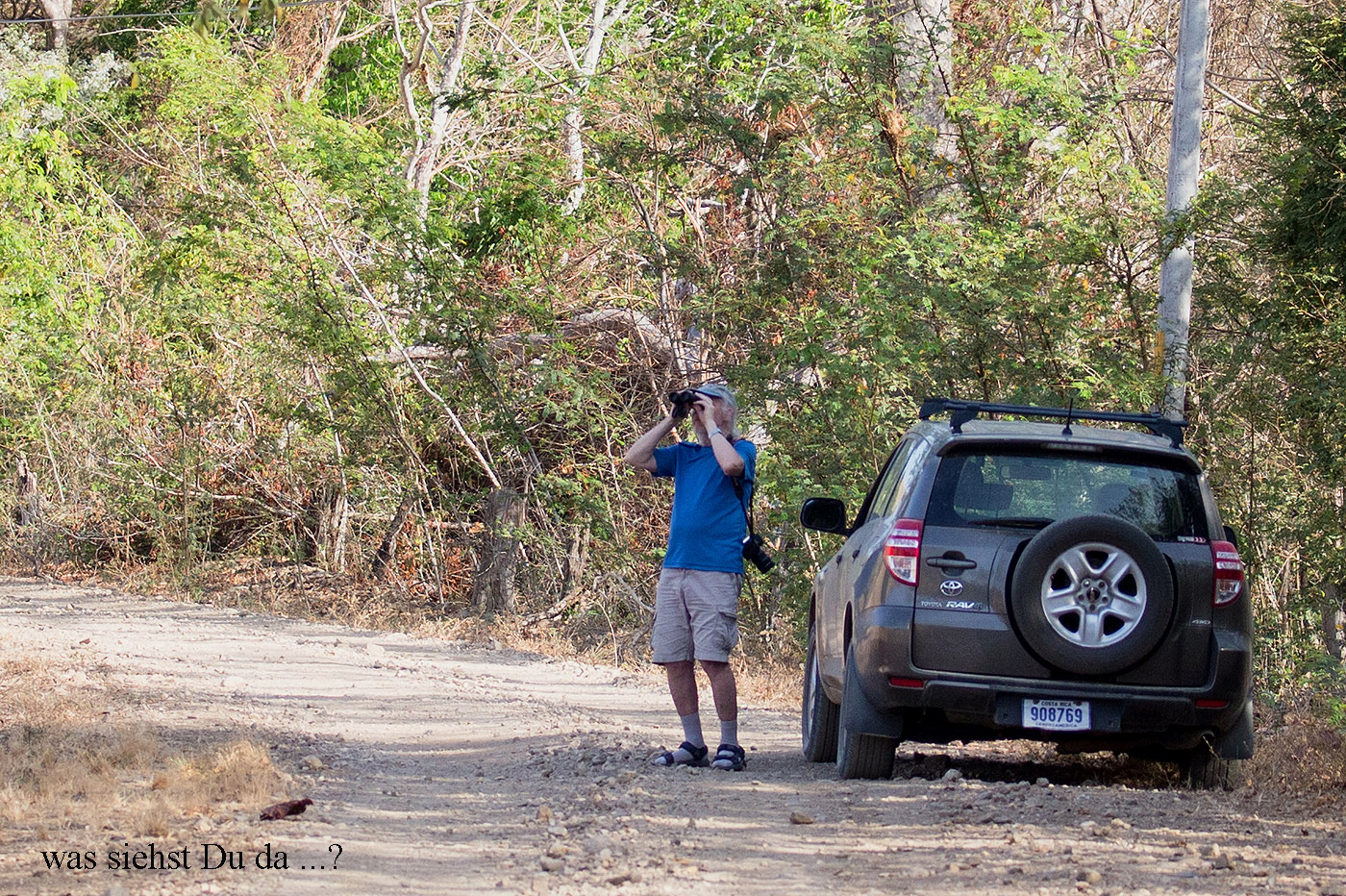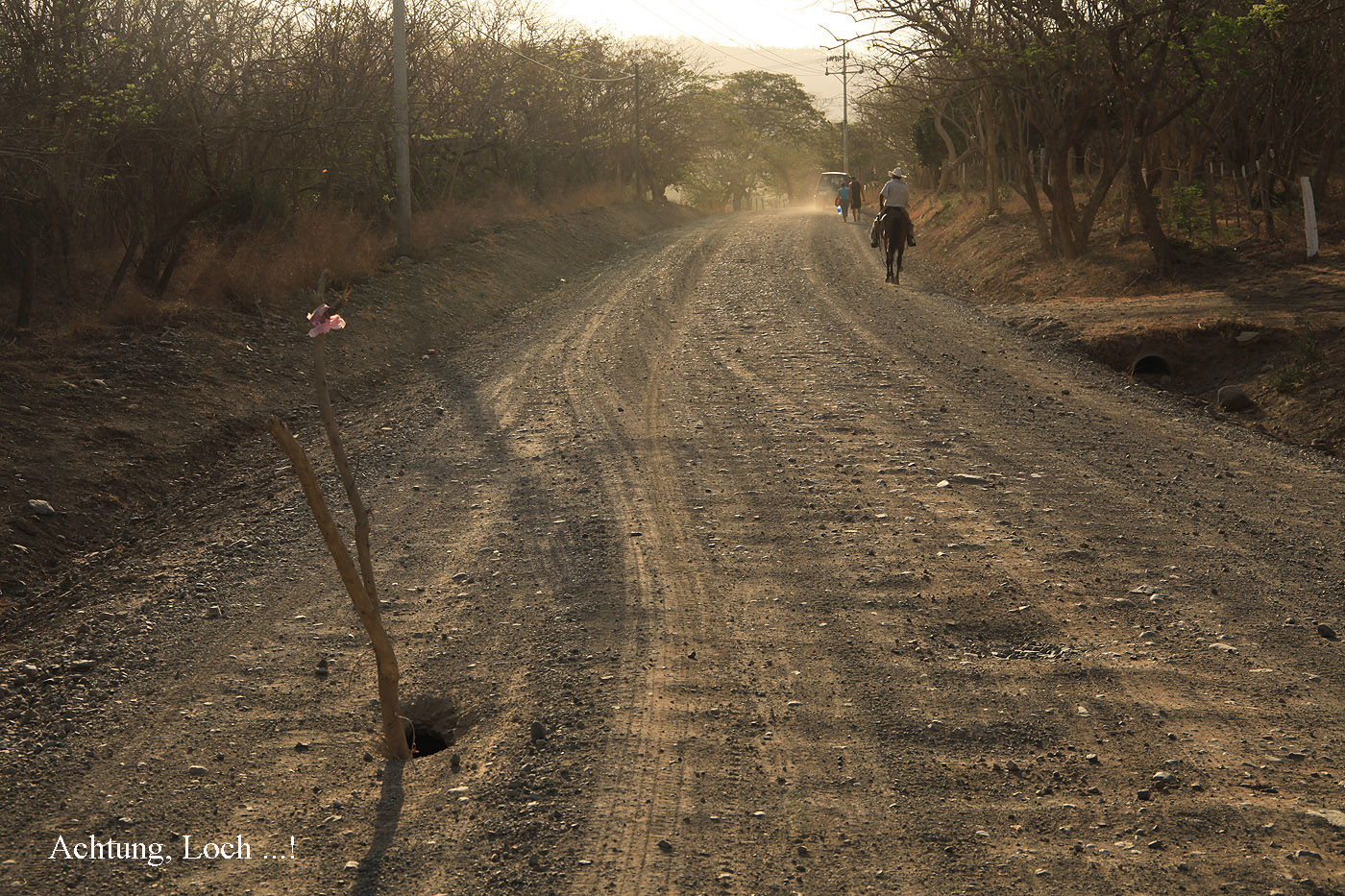 Diesmal hatten wir besser geschlafen. Um 5:30 h standen wir auf und machten uns fertig zu einer kleinen Rundfahrt vor dem Frühstück. Auf dem Baum direkt neben unserem Bungalow saß ein Brüllaffe hoch in den Zweigen und hangelte sich durch das Geäst. Dadurch lösten sich zahlreiche der großen bohnenähnlichen trockenen Früchte, die auf das Dach des Bungalows prasselten und dabei einen Höllenlärm verursachten. Das Wetter war trocken und sonnig. Um 6:00 h waren wir startbereit. Schnell erreichten wir La Cruz, wo wir auf einer anderen Straße als gestern in die Tiefebene abbogen Richtung Meer. Unsere Hoffnung, Gelbnackenamazonen zu sehen, war nicht allzu groß. Nach den Erlebnissen gestern waren wir schon mit der Aussicht zufrieden, wohlbehalten ohne Unfall wieder zurückzukommen. Doch schon nach kurzer Zeit überflogen uns die ersten Amazonen. Wir zählten nach und nach bis zu zehn Vögel. An einer Stelle hielt ich kurz an und machte ein Foto von einem tiefen Loch in der unbefestigten Straße, das nur mit einem Stock gekennzeichnet war. |