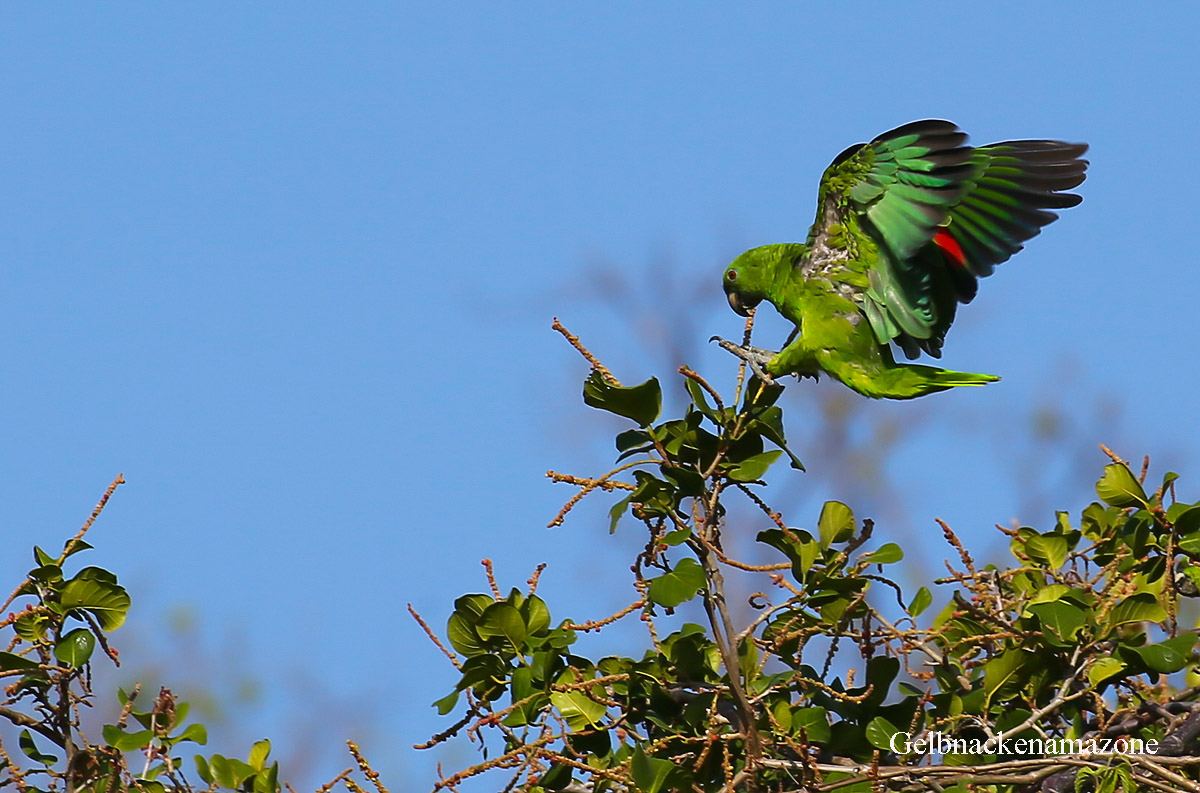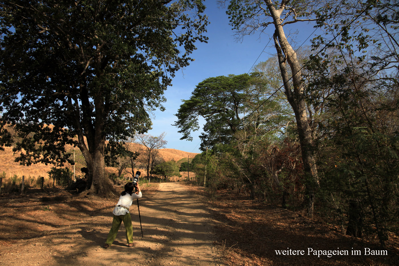 Es war sehr eindrucksvoll, die typischen Geräusche eines Bauernhofs aus direkter Nähe zu erleben. Wir fuhren weiter. Mir kam die Gegend irgendwie bekannt vor. Wir durchquerten wieder einige trockene Flussbette. Als ich in einem dieser Flussbette das Wurzelwerk eines großen Baums erblickte, den ich gestern schon fotografiert hatte, wurde mir plötzlich klar, dass wir auf dem gleichen Weg unterwegs waren wie gestern. An der nächstbesten Stelle wendete ich das Auto und wir fuhren zurück. Das erwies sich als großes Glück, denn kaum waren wir ein paar Hundert Meter gefahren, als wir wieder Gelbnackenamazonen erblickten, die sich in einem nahen Baum niederließen. Tomoko stieg aus und fotografierte unermüdlich. |