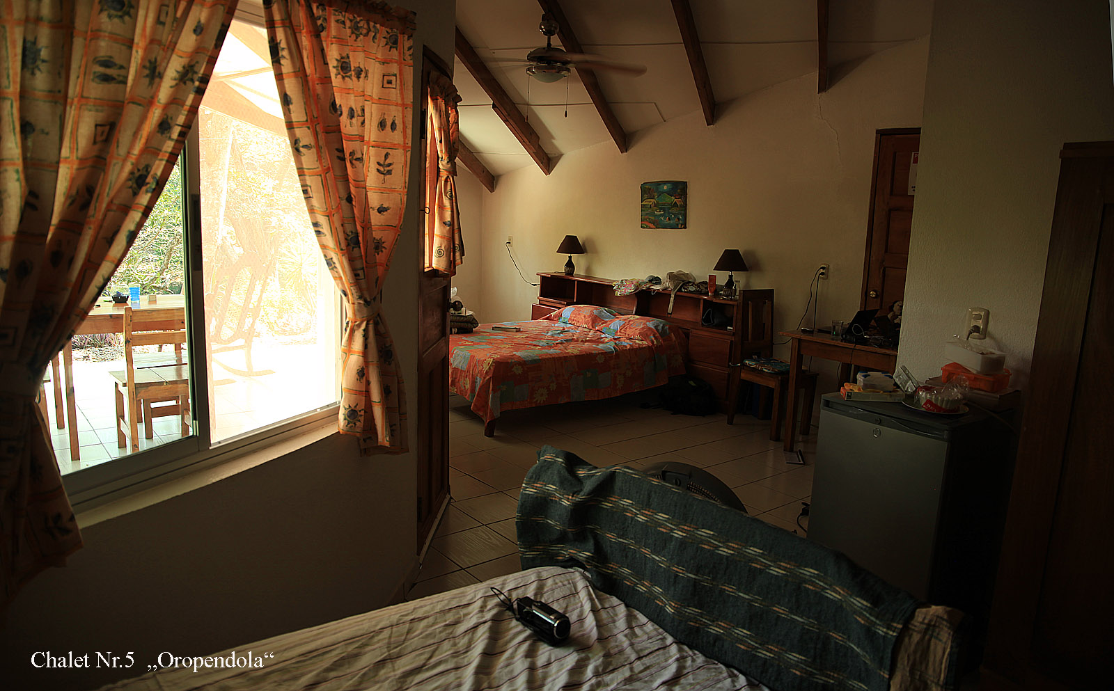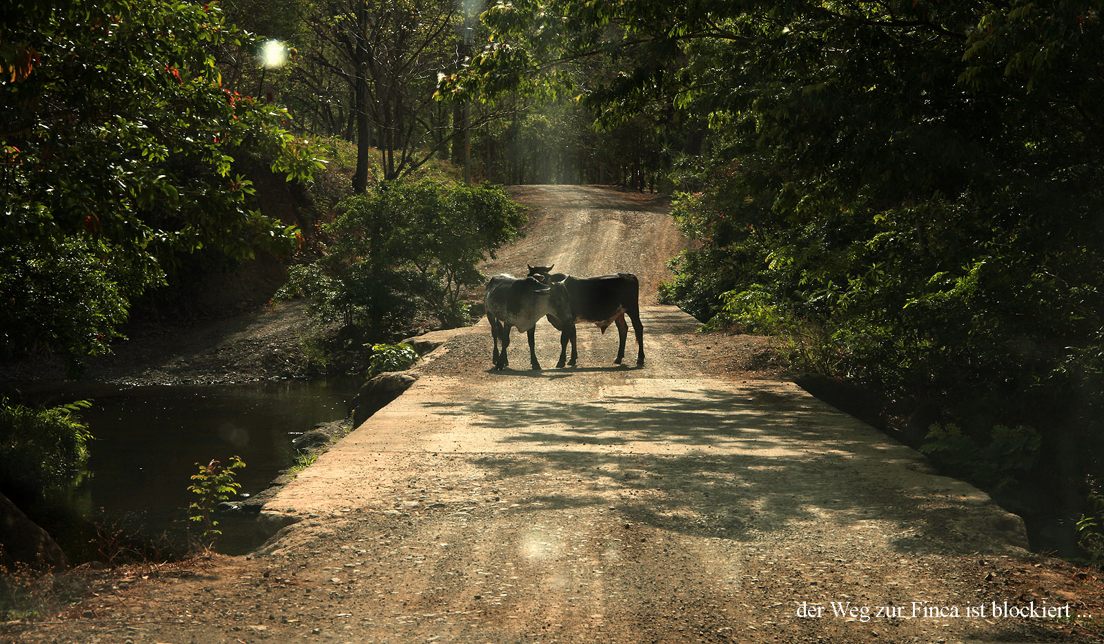 Manche der Vögel hatten einen kräftigen gelben Fleck im Nacken, andere, wahrscheinlich Jungvögel, kaum oder gar nicht. Irgendwann waren alle Amazonen wieder in den nahen Büschen verschwunden. Tomoko war überglücklich. Da es langsam Zeit war für ein Frühstück, fuhren wir zurück. Kurz vor erreichen der Finca standen 2 Kühe auf dem Weg und blockierten die Brücke, gaben aber nach ein paar Minuten den Weg frei. Gegen 9:00 h kamen wir an und gingen auch gleich nach vorne zum Rancho, wo uns wieder ein schmackhaftes Frühstück serviert wurde. besonders das Rührei mit Petersilie sowie das selbst gebackene Brot schmeckten vorzüglich. Für unser Bärchen war natürlich das Marmeladenbrot am wichtigsten. Die Fledermäuse waren auch wieder im Kamin zu sehen. |