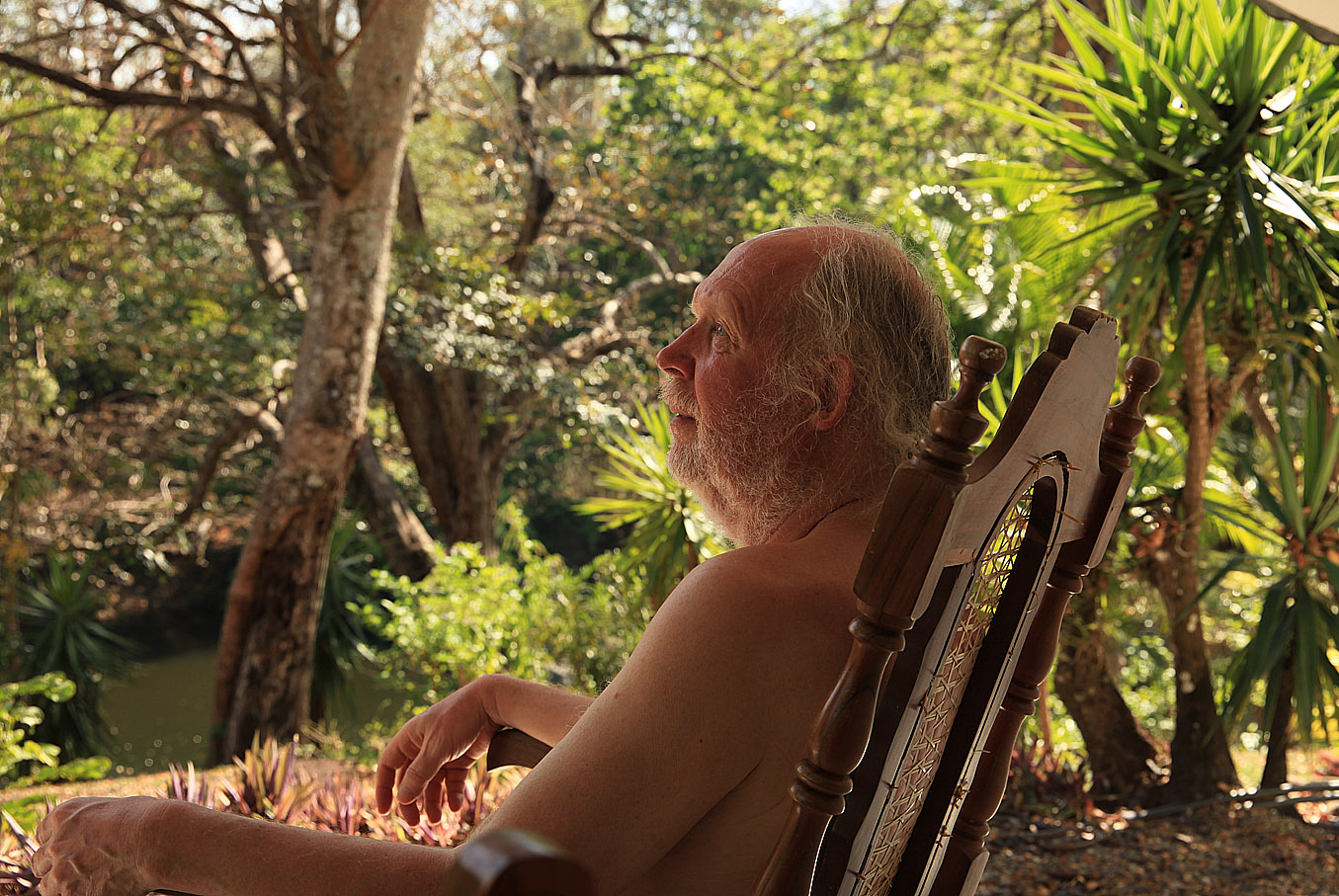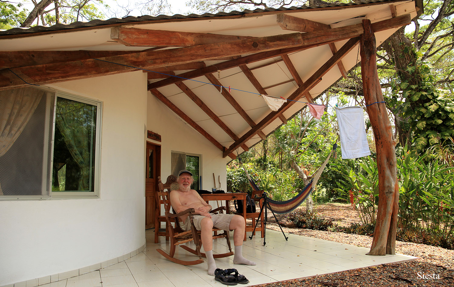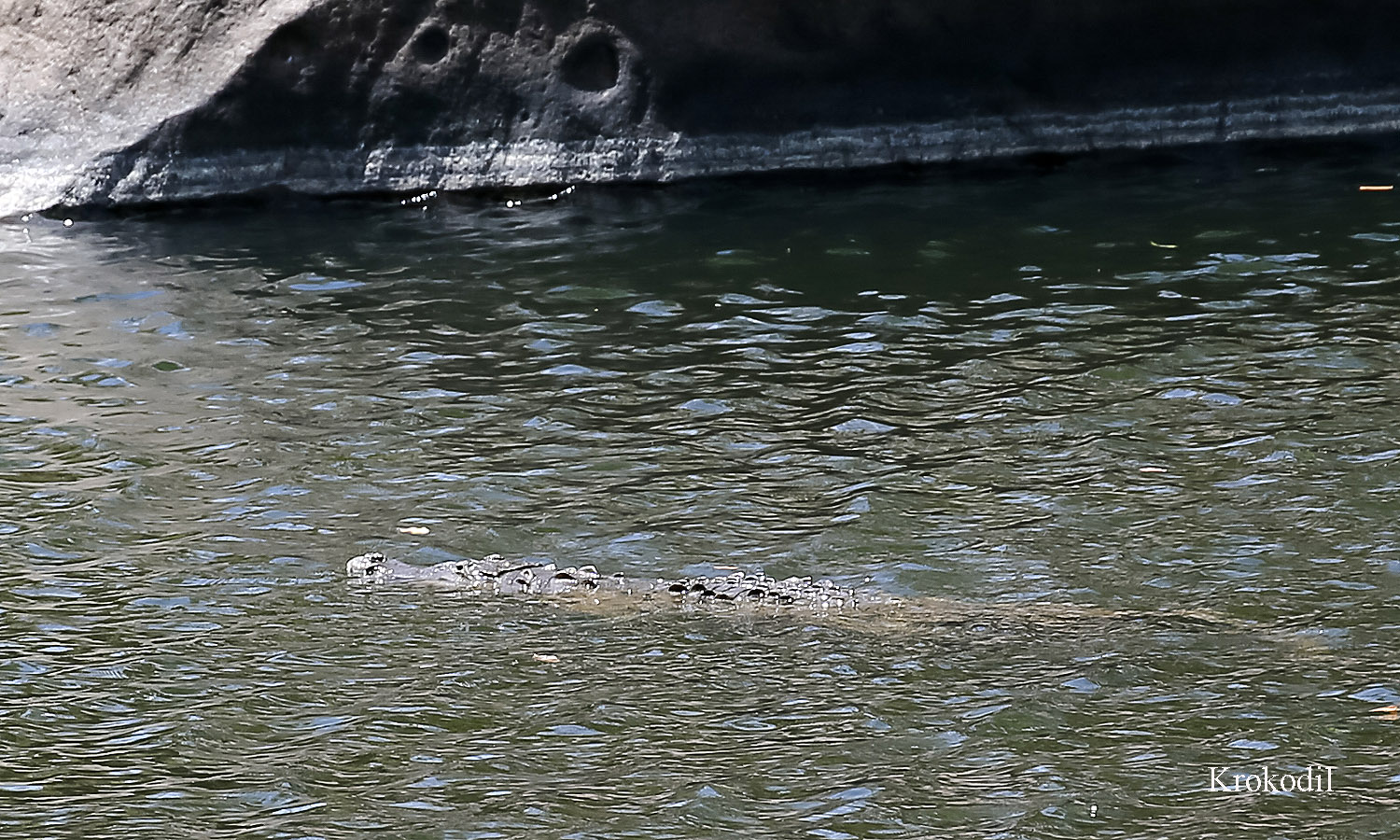 Da man hier waschen lassen konnte, ließen wir gleich einen Beutel mit schmutziger Wäsche zum Waschen da. Nachdem wir ganz gemütlich uns gestärkt hatten, gingen wir gegen 10:10 h zum Bungalow zurück. Dabei sahen wir wieder ein Krokodil im Fluss schwimmen. Zurück im Zummer sortierten und speicherten wir Fotos und Videos, wegen des besseren Lichts (keine Spiegelungen), machten wir das im Inneren, gekühlt von unseren Ventilatoren. Zwischendurch legte sich Tomoko auf der Terrasse in die Hängematte und ich setzte mich in den Schaukelstuhl. |