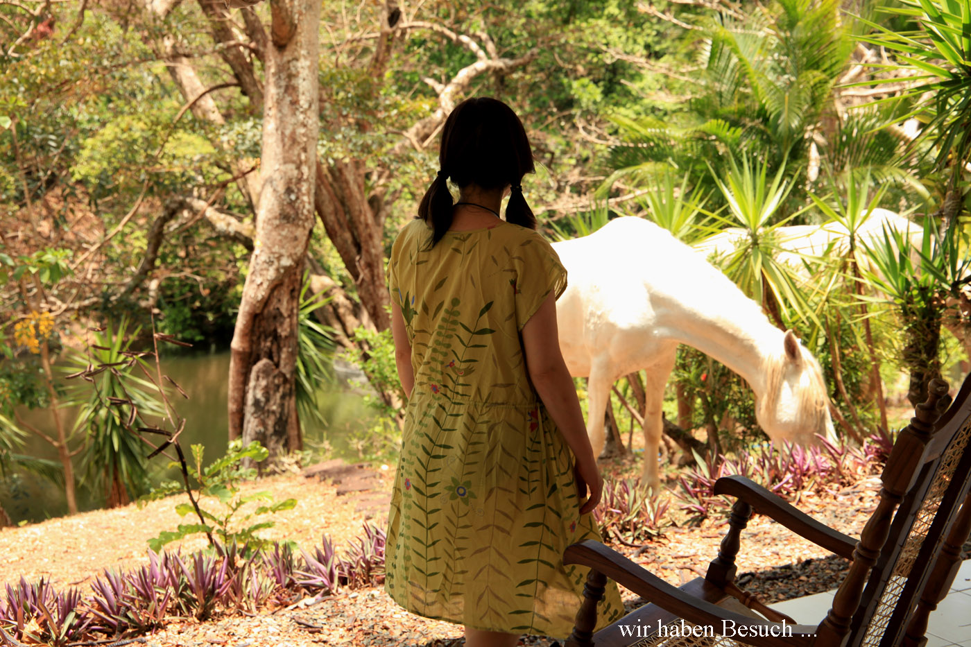 Gegen Mittag wurde es immer wärmer. Um 12:00 h stand die Sonne genau senkrecht über uns. Die Temperatur stieg auf 37° im Schatten. Wir faulenzten weiter gemütlich im Schatten, aßen mal eine gekühlte Mango oder wie Tomoko eine Avocado. Plötzlich bekamen wir Besuch von einigen Pferden, die das Gras zwischen den Pflanzen neben unserem Bungalow fraßen. |