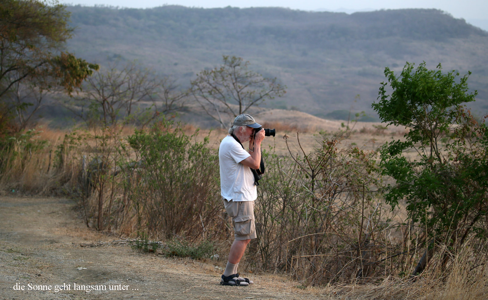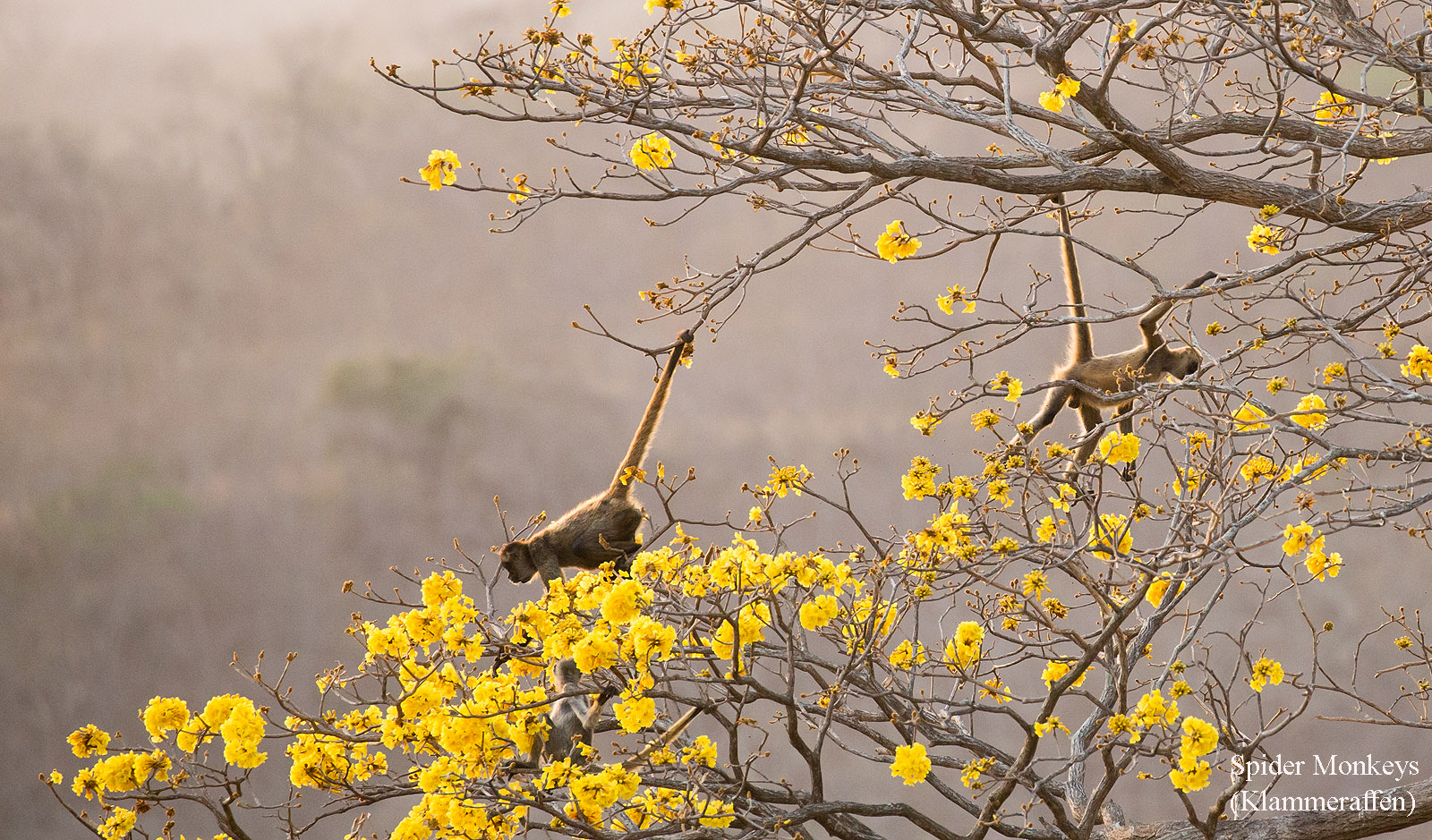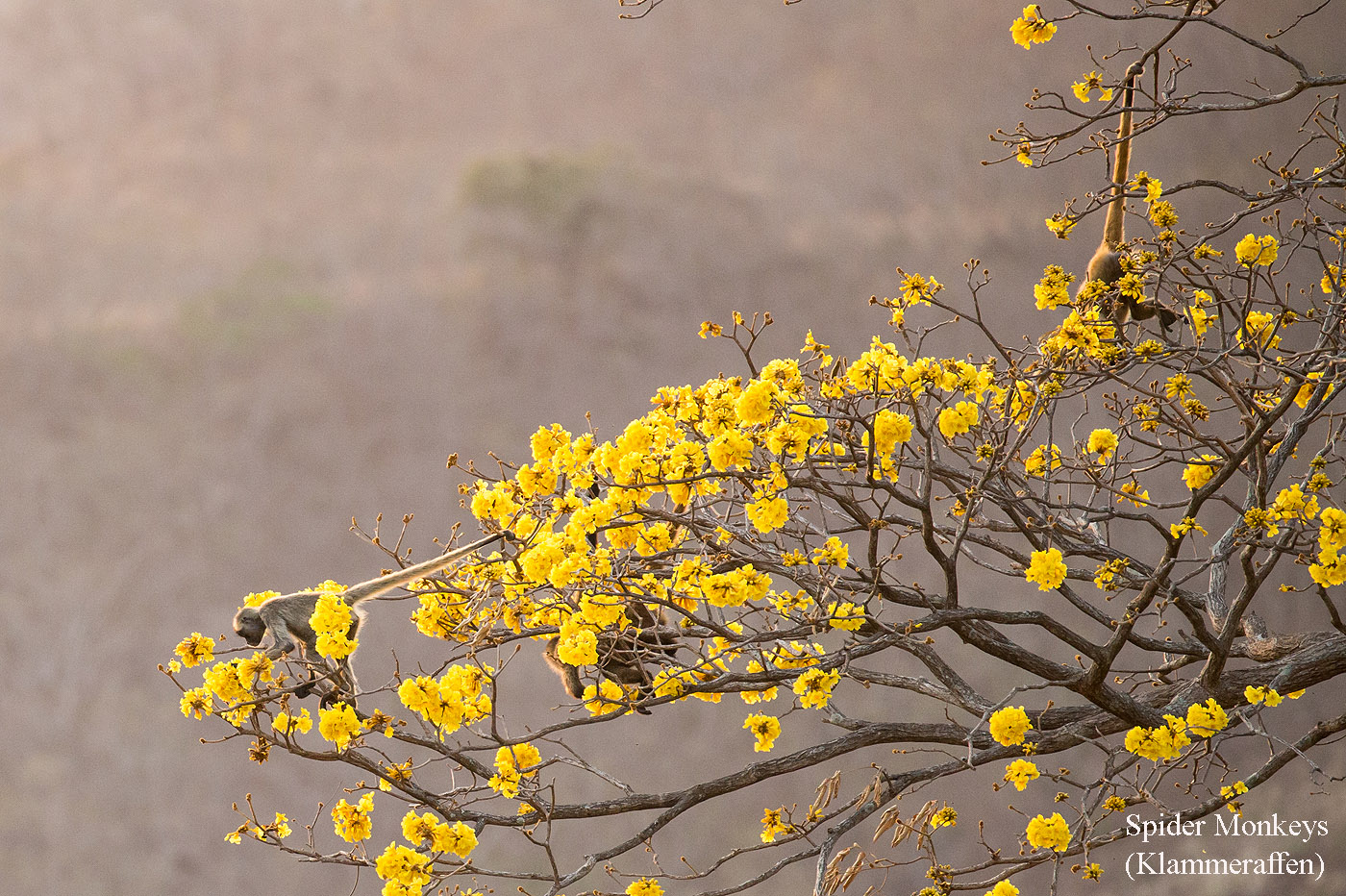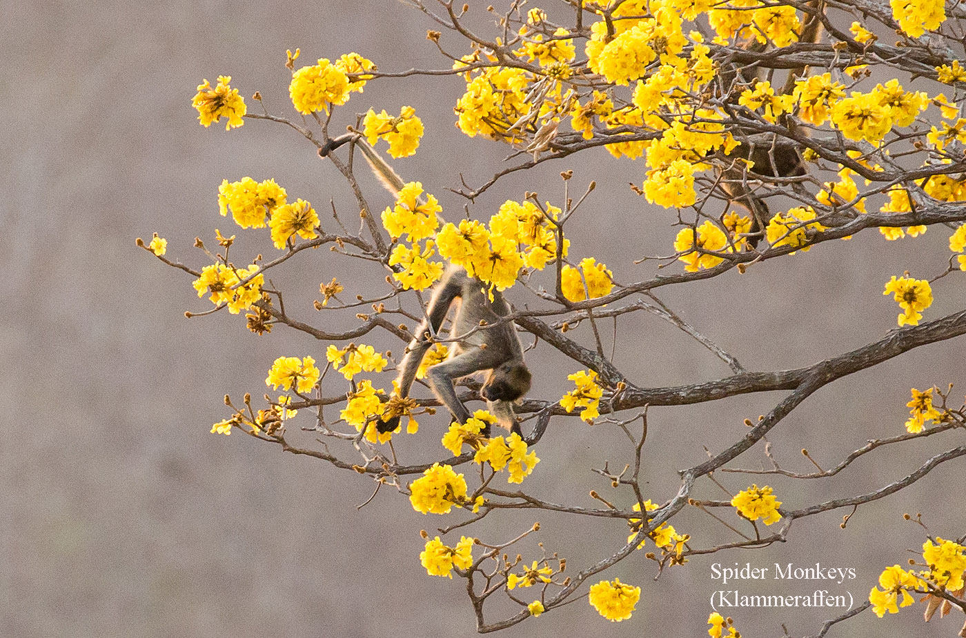 Da das Licht so toll war, nahm ich die Szene auch auf Video auf. Ich hatte vorhin wahnsinniges Glück gehabt, als ich mit dem Auto ein paar Meter zurücksetzte und dabei im Rückspiegel nicht sah, dass dort eine kleine Brücke über ein trockenes Flussbett führte und ich um ein Haar von der Straße abgekommen wäre. Es waren nur wenige cm, die mich vor einem Sturz ins Flussbett trennten... Wir fuhren langsam weiter, doch so sehr wir auch Ausschau hielten, die Gelbnackenamazonen tauchten heute Abend nicht auf. Gegen 17:30 h machten wir uns auf den Rückweg. In der steilen Passage der Straße kurz vor La Cruz machten wir zunächst einen Stopp, um die zahlreichen Geier zu beobachten, die sich hier in mehreren Schlafbäumen versammelt hatten. Wir fuhren noch mal ein paar Meter zurück um den Sonnenuntergang von der Anhöhe zu genießen. Dabei sahen wir 3 Klammeraffen (Spider Monkeys) in einem Baum voller gelber Blüten herum klettern, was im Abendlicht besonders eindrucksvoll war. |