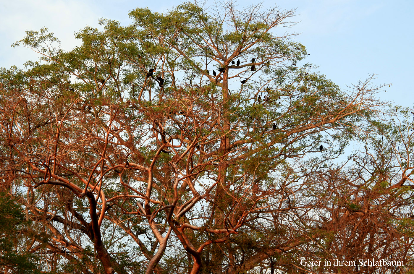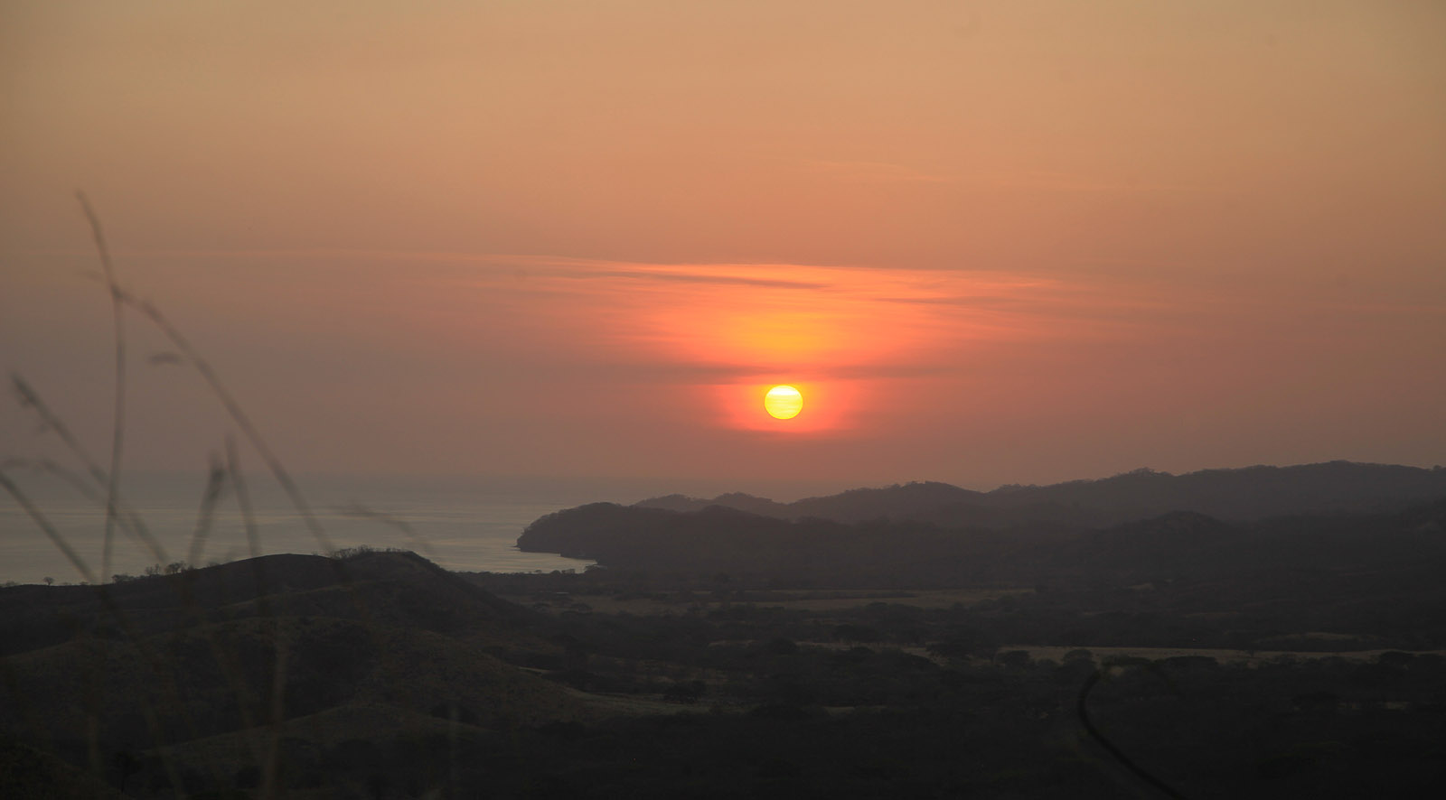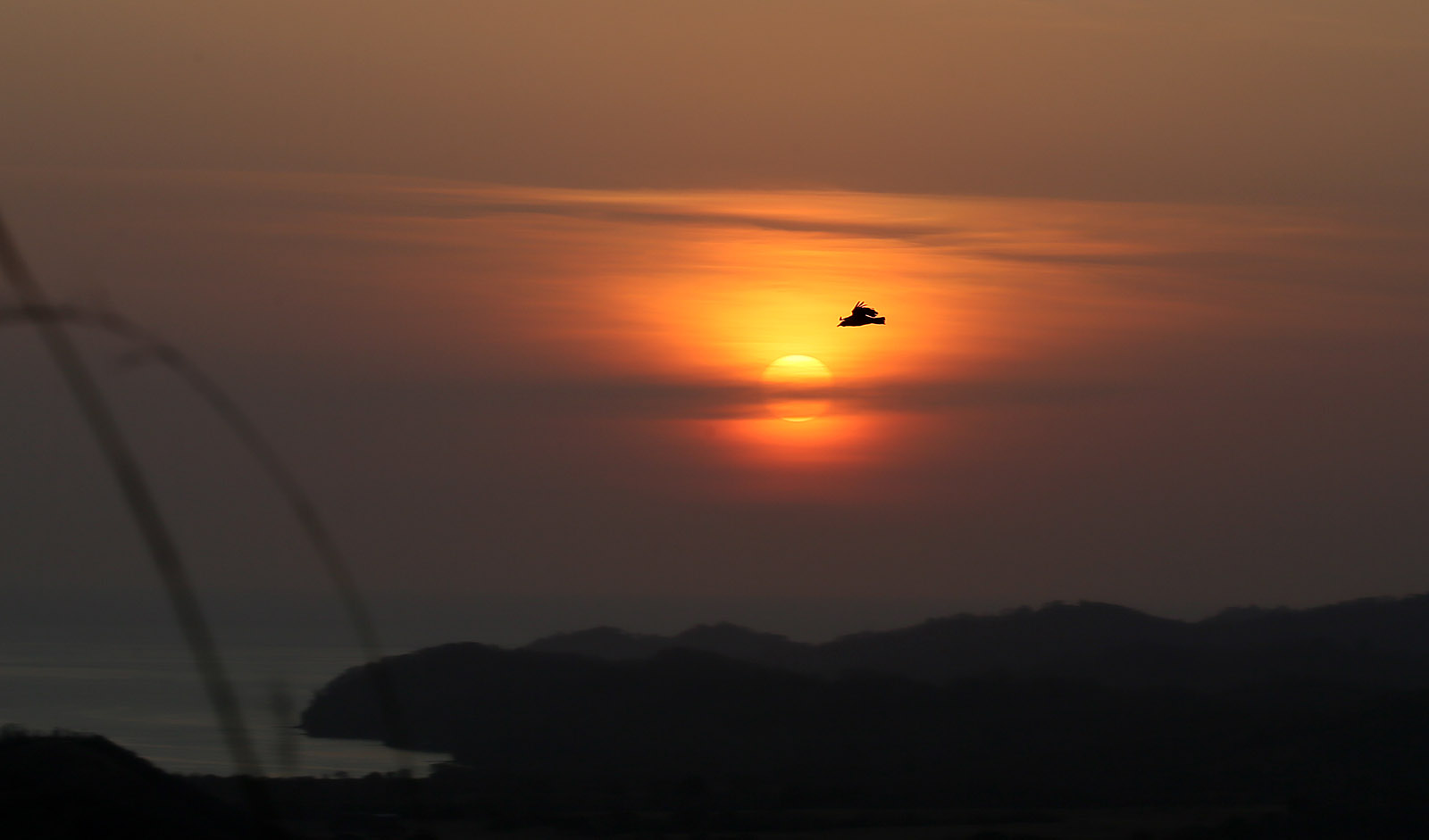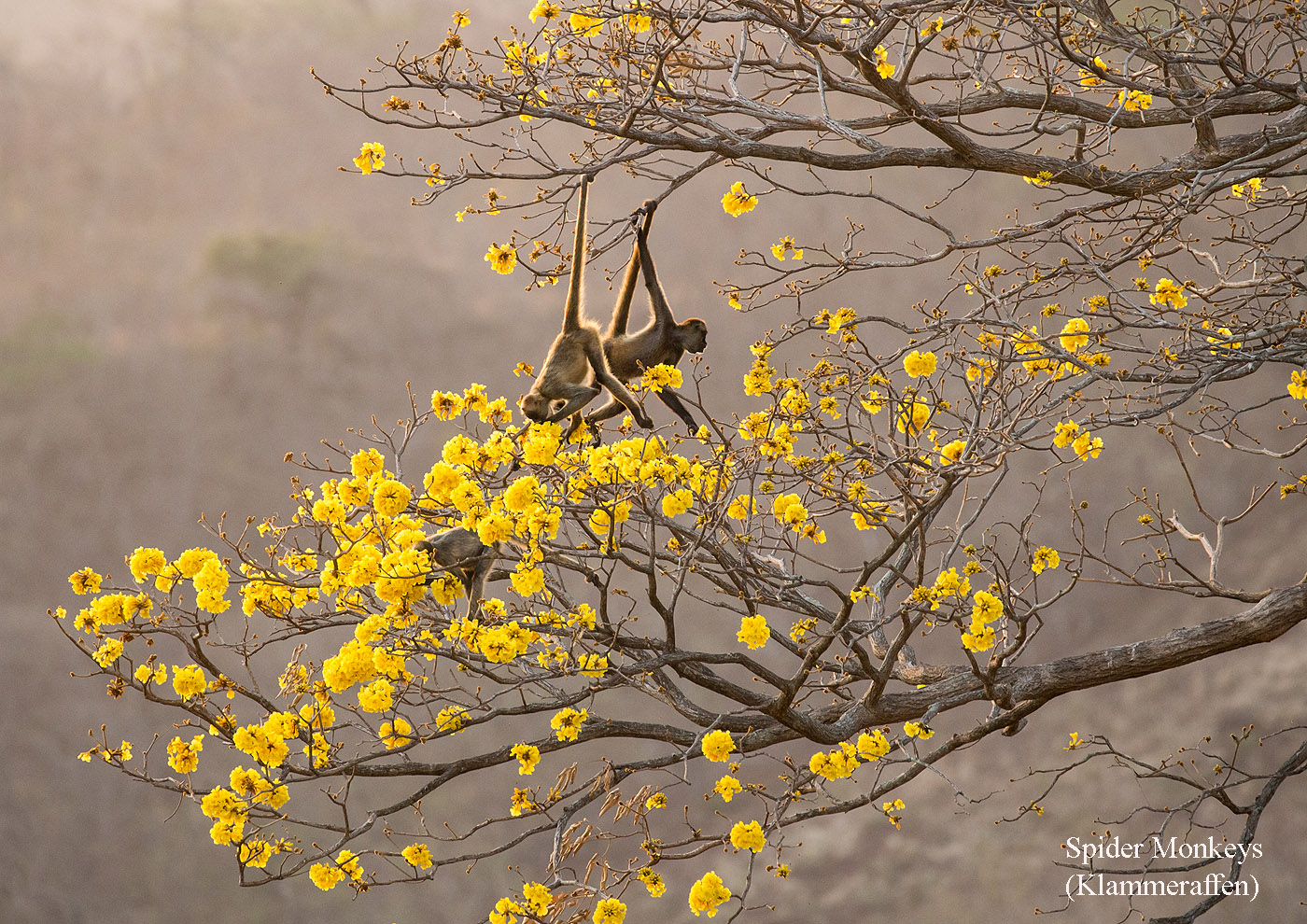 Da das Licht so toll war, nahm ich die Szene auch auf Video auf. Ich hatte vorhin wahnsinniges Glück gehabt, als ich mit dem Auto ein paar Meter zurücksetzte und dabei im Rückspiegel nicht sah, dass dort eine kleine Brücke über ein trockenes Flussbett führte und ich um ein Haar von der Straße abgekommen wäre. Es waren nur wenige cm, die mich vor einem Sturz ins Flussbett trennten... Wir fuhren langsam weiter, doch so sehr wir auch Ausschau hielten, die Gelbnackenamazonen tauchten heute Abend nicht auf. Gegen 17:30 h machten wir uns auf den Rückweg. In der steilen Passage der Straße kurz vor La Cruz machten wir zunächst einen Stopp, um die zahlreichen Geier zu beobachten, die sich hier in mehreren Schlafbäumen versammelt hatten. Wir fuhren noch mal ein paar Meter zurück um den Sonnenuntergang von der Anhöhe zu genießen. Dabei sahen wir 3 Klammeraffen (Spider Monkeys) in einem Baum voller gelber Blüten herum klettern, was im Abendlicht besonders eindrucksvoll war. |