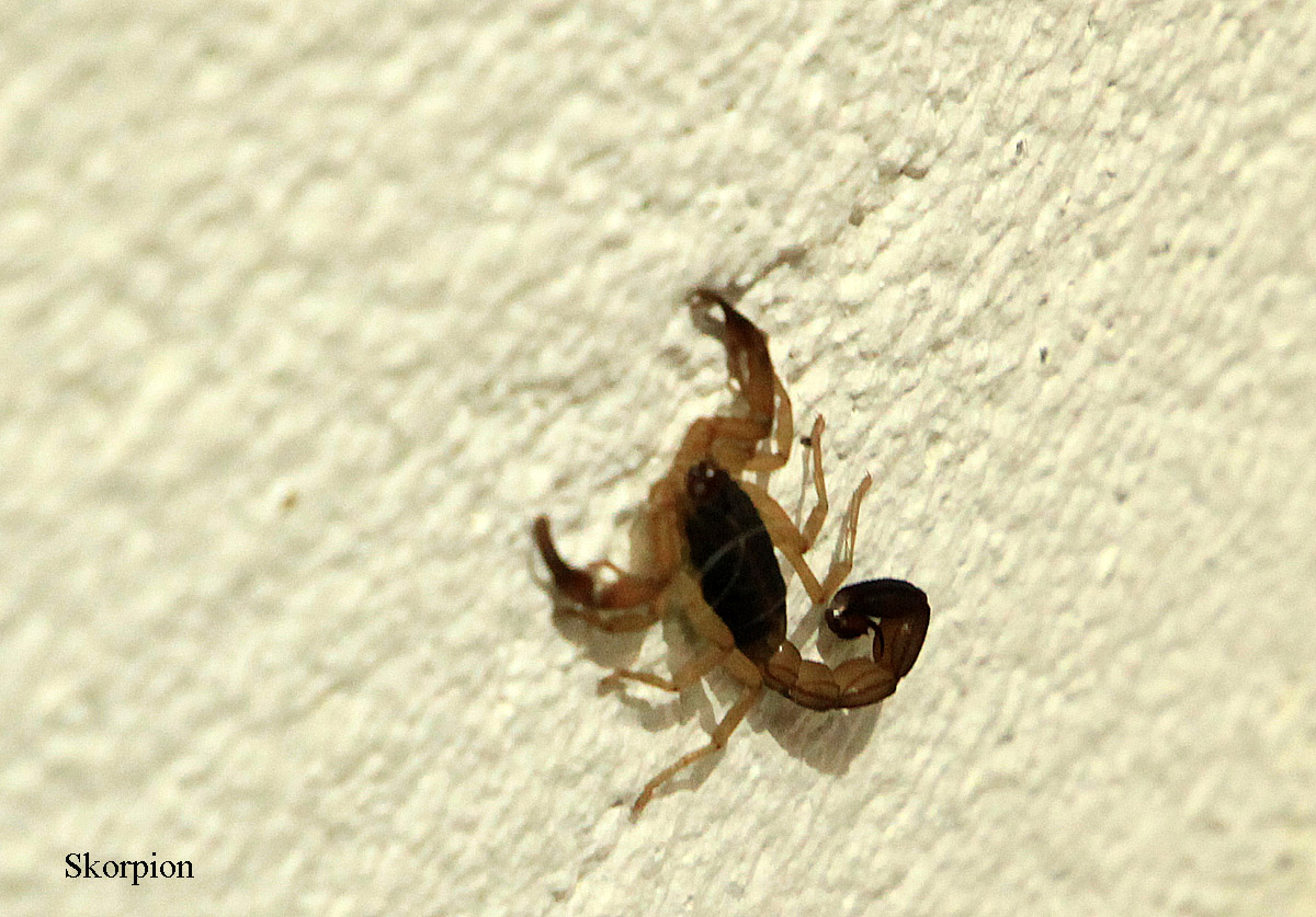 Was tun ? Der erste Gedanke war, einfach das Tier zu erschlagen, doch das widerstrebte mir irgendwie. Ich suchte nach einem geeigneten Behälter um den Skorpion vielleicht einfangen zu können. Ich fand einen leeren Mülleimer, der mir dafür geeignet erschien. Erst machten wir noch ein Foto, dann bewegte ich vorsichtig den Eimer unter den Skorpion. Doch da die Wand an dieser Stelle etwas gewölbt ist, schlüpfte das Tier blitzschnell am Eimer vorbei und verschwand in rasendem Tempo unter meinem Bett. Schnell lief ich ums Bett herum und als der Skorpion auf der anderen Seite wieder hervorkam, konnte ich mir nicht anders helfen, als ihn mit einem gezielten Tritt mit meinen Sandalen zu töten. Das tat mir sehr leid, doch in Anbetracht der Gefährlichkeit dieses Tieres, war das wohl die beste Lösung. Nach diesem Schrecken holten wir erst mal tief Luft. Dann schauten wir sorgfältig in alle Ecken des Zimmers, stellten die Koffer hoch und leuchteten unter die Betten. Außer ein paar Ameisen und einer Kakerlake fanden wir aber nichts weiteres mehr. Wir duschten noch beide und gingen dann zu Bett. Das Erlebte beschäftigte uns noch eine Weile, so dass wir erst spät einschliefen. |