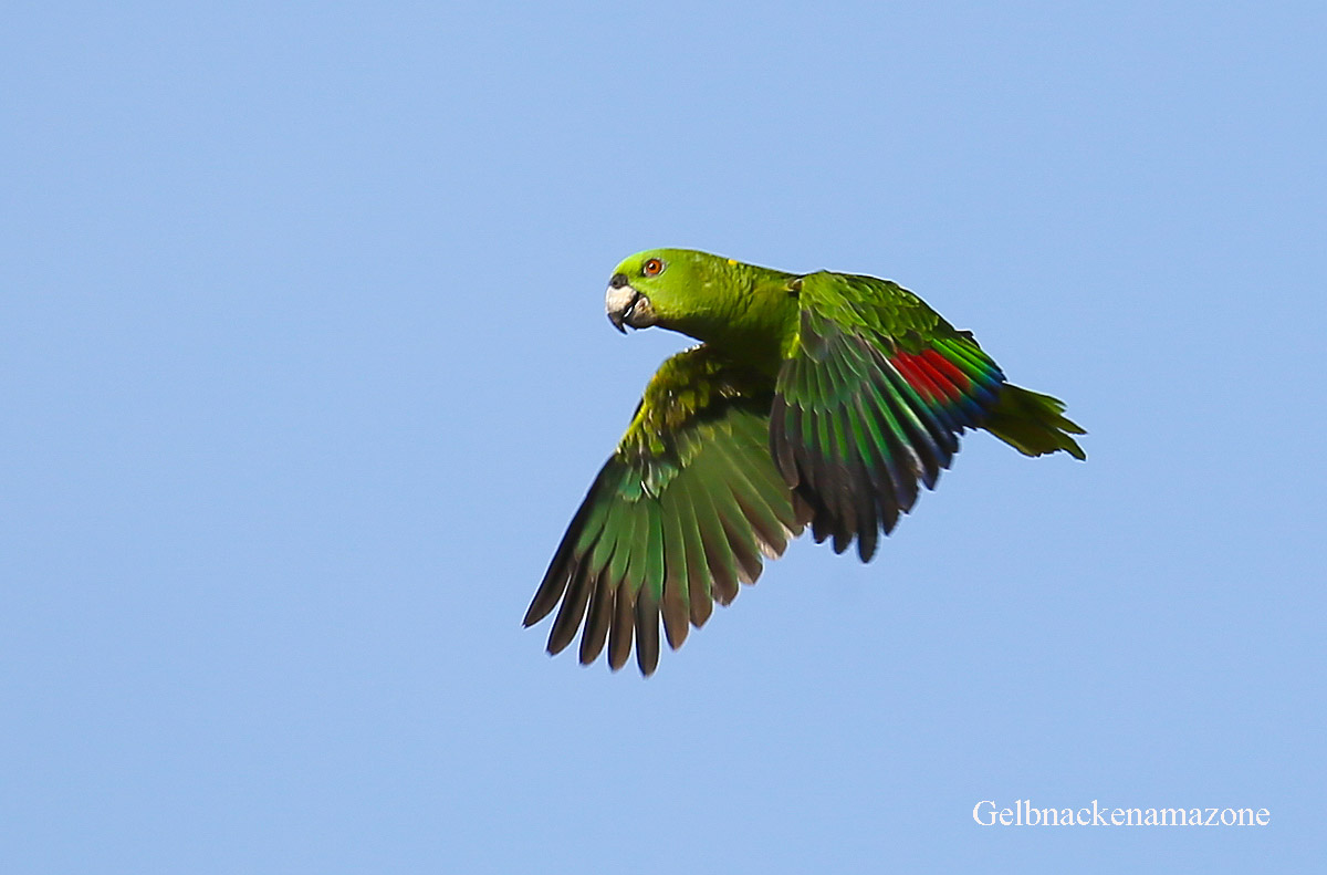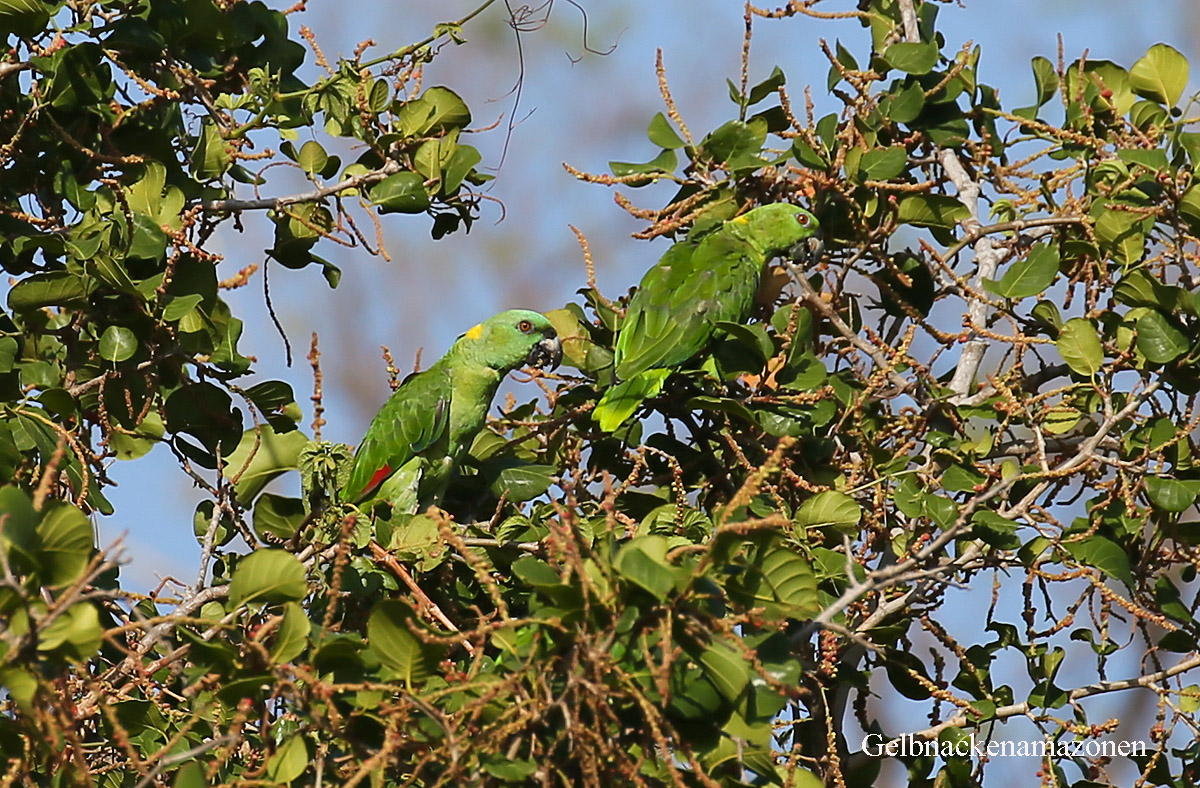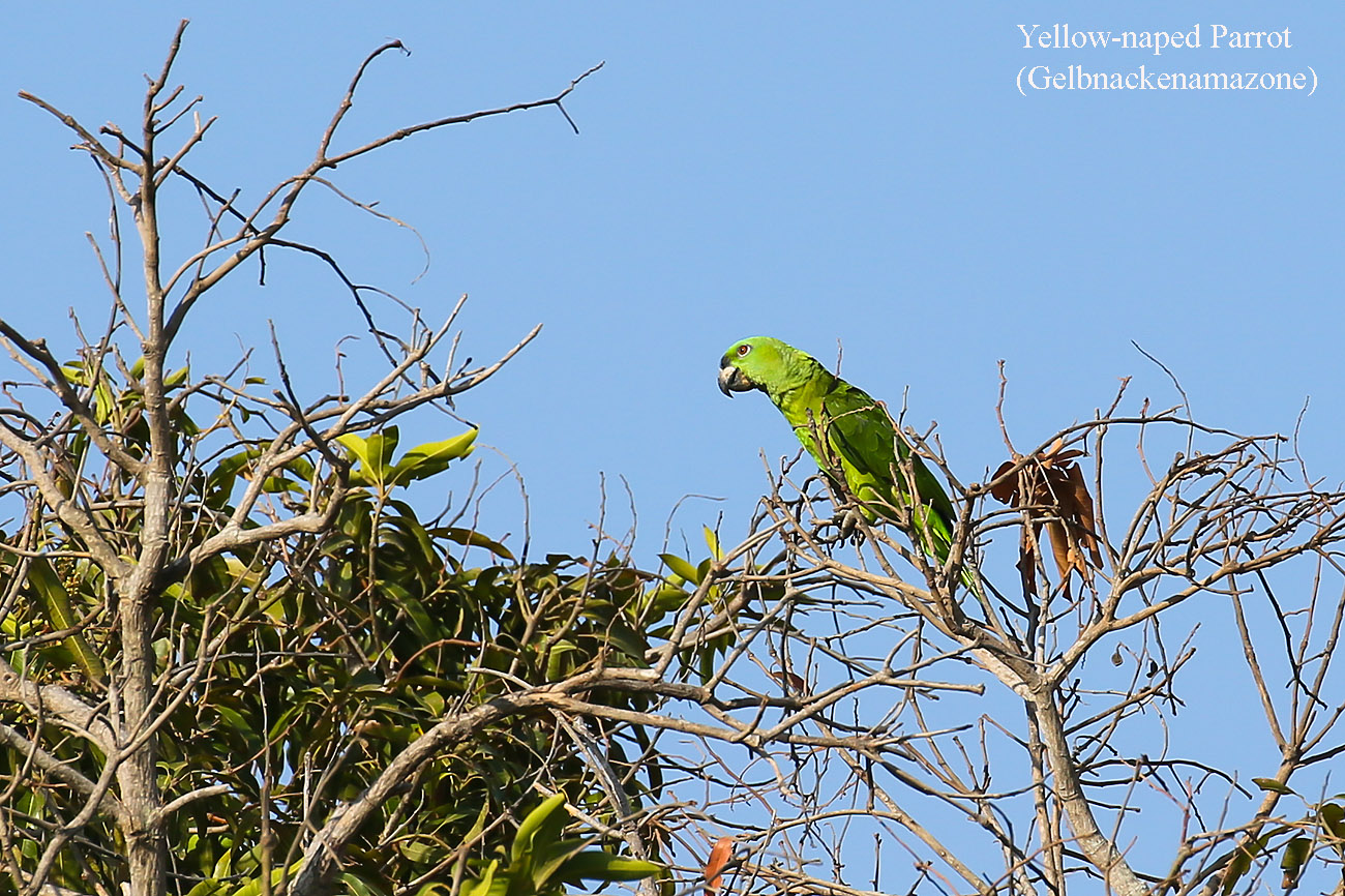 Wir fuhren weiter. Ich bog in einen kleinen Weg ein. Wir passierten einige kleine Ansiedlungen. Immer wieder hörten wir die Rufe der Amazonen, die eher dem Quaken einer Ente ähnelten als dem Krächzen eines Papageis. Endlich sah ich wie 2 Gelbnackenamazonen in einem Baum landeten. Schnell ergriff Tomoko ihre Kamera und stieg aus. |