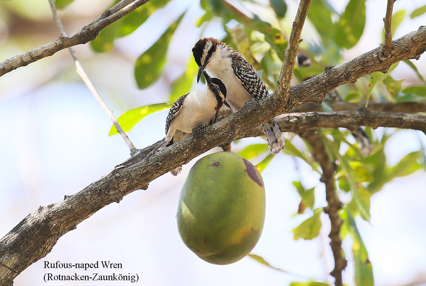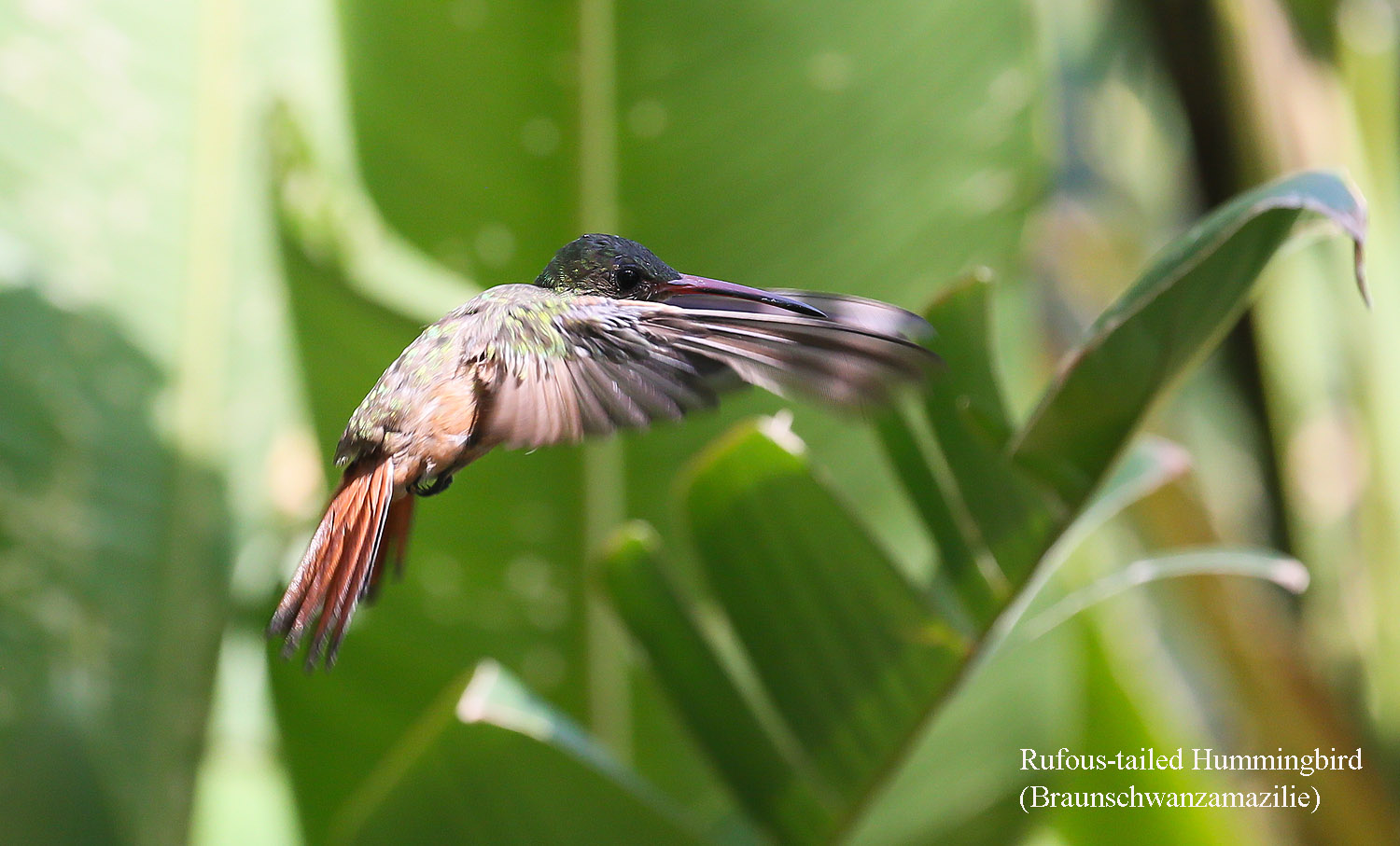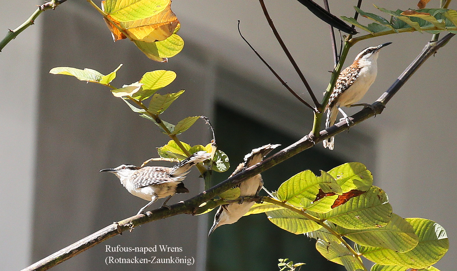 Zwischendurch gab es immer wieder etwas zu sehen, besonders einige Rufous-naped Wrens waren sehr aktiv. Auch kam immer wieder ein Kolibri zu den Blüten der Heliconia-Pflanzen neben unserer Terrasse. |