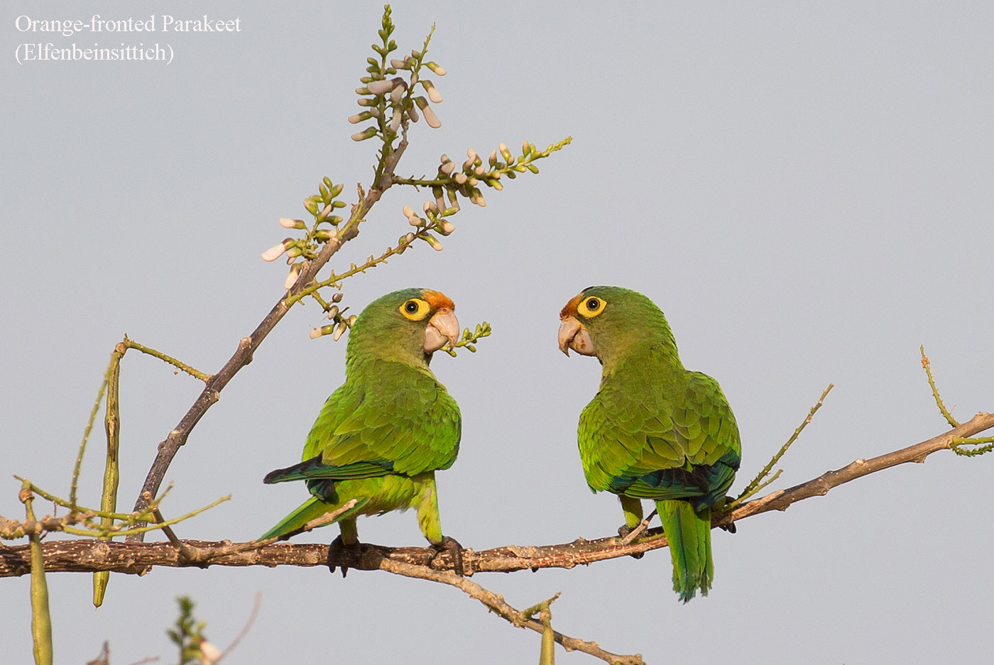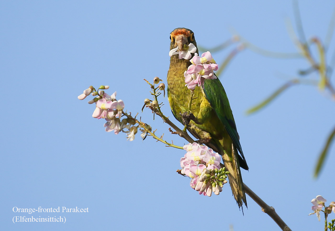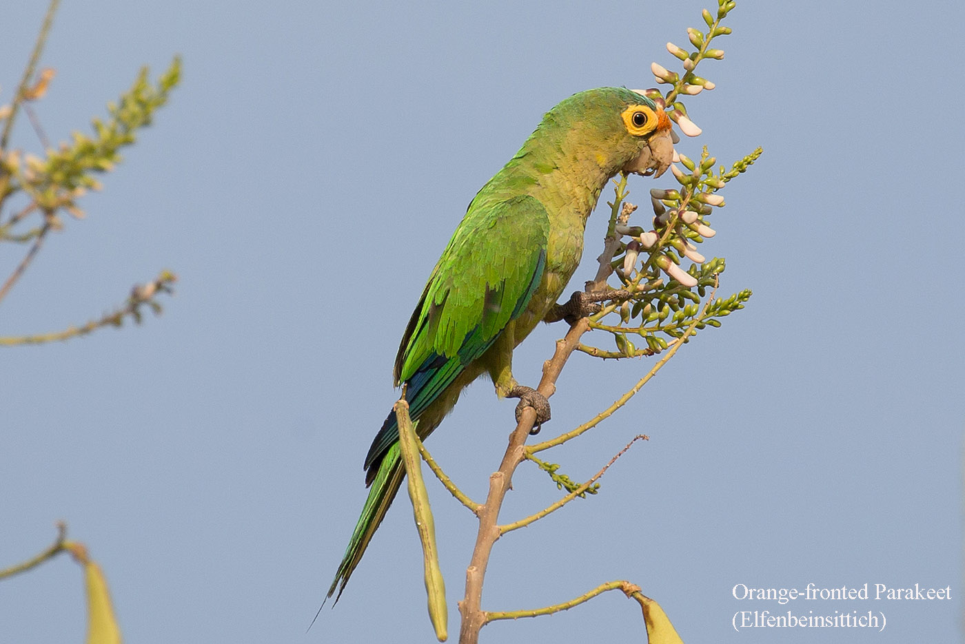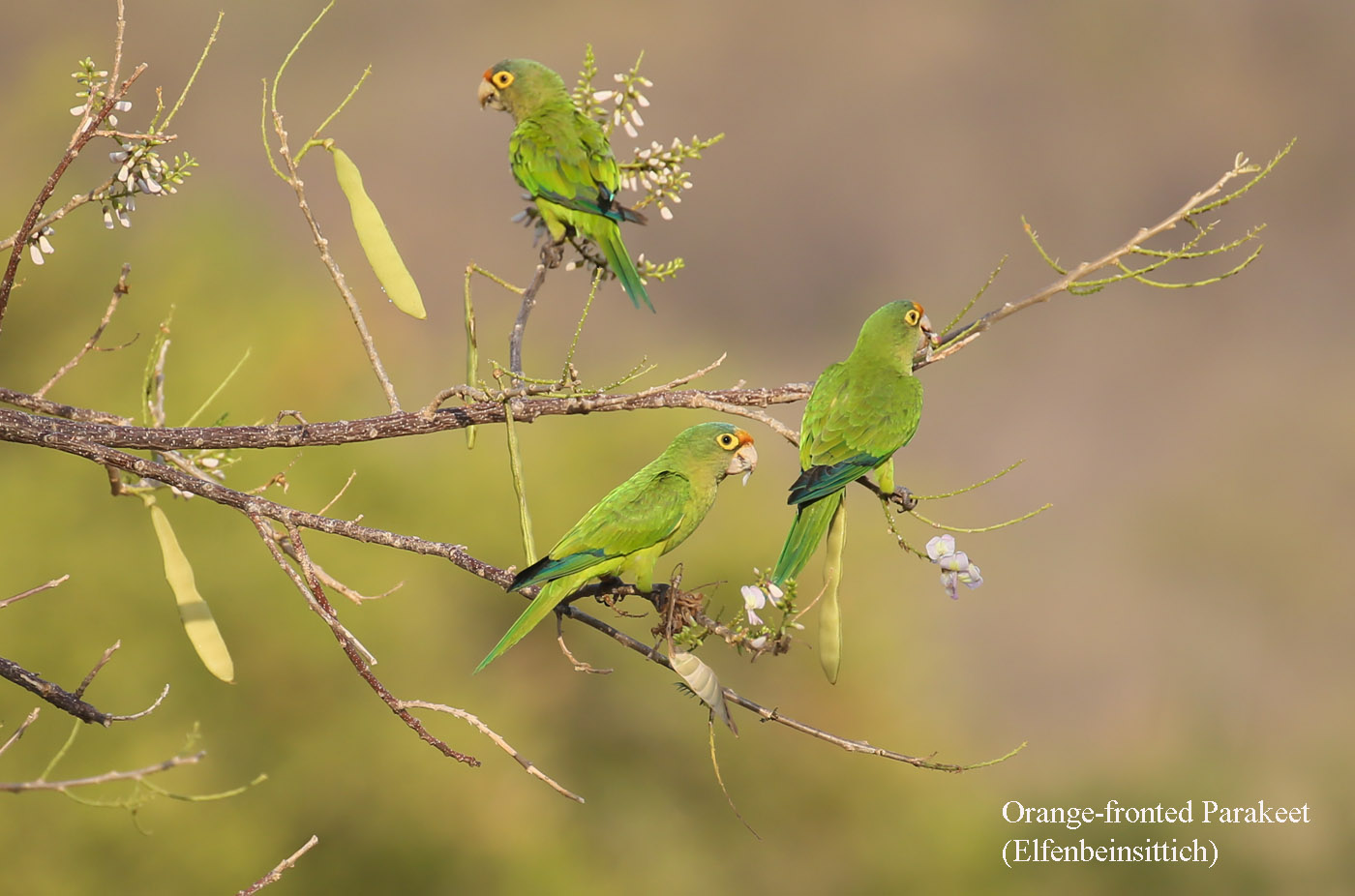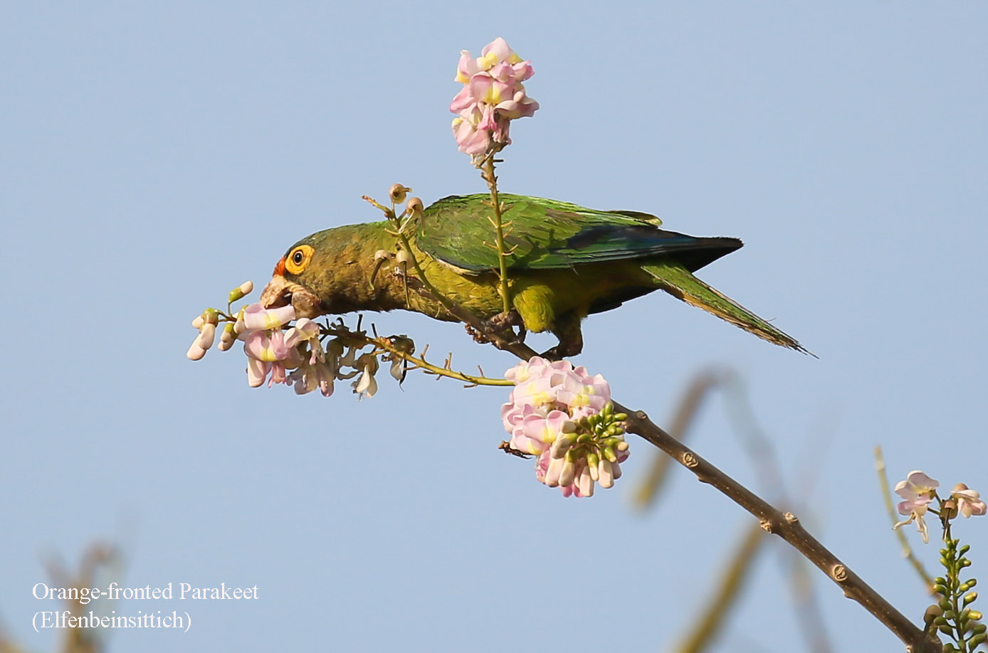 Gegen 16:15 h machten wir uns bereit zu einer kleinen Fahrt zur gleichen Stelle wie heute Morgen in der Hoffnung wieder einige Papageien sehen zu können. Am späten Nachmittag lag ein wunderbares Licht über der Landschaft. Einige km hinter La Cruz entdeckten wir in einem kleinen Baum neben der Straße einige Papageien ( Orange-fronted Parakeets), die dort im Licht der schon tief stehenden Sonne an den Blüten des Baumes pickten. |