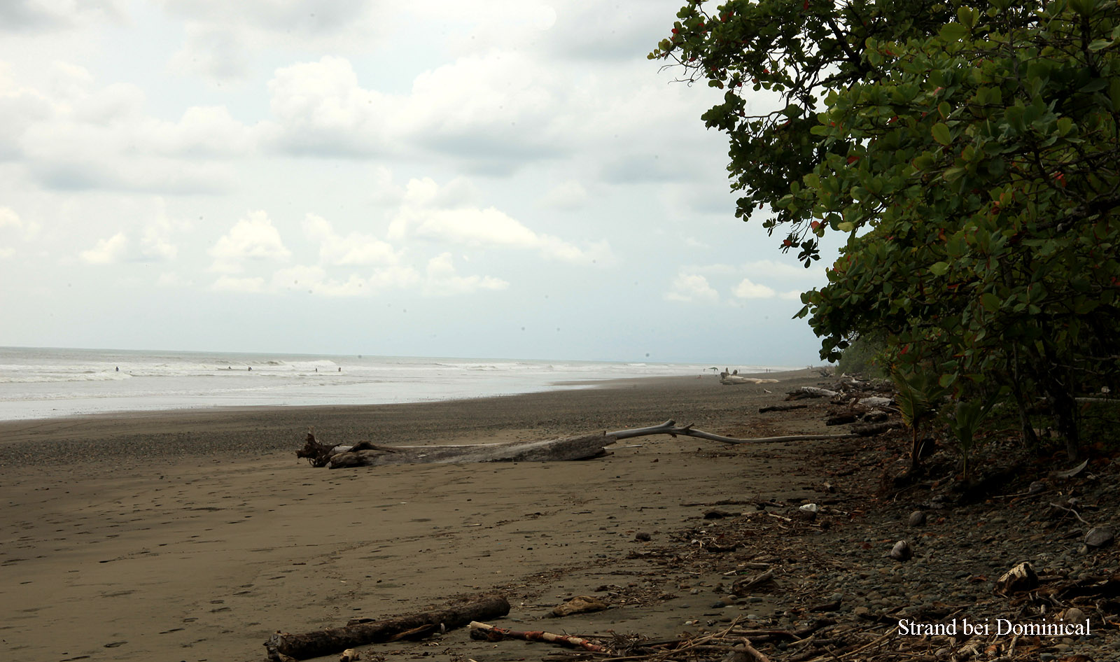Nach dem Frühstück blieben wir am Tisch sitzen. Da hier eine ausgezeichnete Internet-Verbindung bestand, blieben wir dort, schrieben einige Emails und surften im Internet. Auch konnten wir über Skype mit Beate in Stuttgart telefonieren. Wir mussten ihr die richtige Zeit in Deutschland durchgeben. Sie bestand fest darauf, dass es dort 17:00 h sei, während ich natürlich überzeugt war, dass es schon 19:00 h sein musste. Erst nach einigem hin und her stellte sie schließlich fest, dass ihre Uhr stehengeblieben war... Ebenfalls rief ich Juan, den Besitzer der Finca Maresia, unserer nächsten Lodge, an und fragte ihn nach den Straßenzuständen auf dem Weg nach Drake auf der Osa-Halbinsel. Mir müssen dort 4-5 Flüsse mit dem Auto durchqueren und wenn der Wasserstand durch heftige Regenfälle zu hoch wird, werden diese unpassierbar. Er sagte, dass im Augenblick alles ok sei, doch sollte ich ihn morgen früh nochmal anrufen um sicher zu sein. Um 12:00 h fuhren wir mal Richtung Dominical auf der Suche nach einem kleinen Supermarkt um Lebensmittel zu kaufen, da Tomoko gerne unsere tolle Küche ausprobieren wollte. Als wir nach 17 km Dominical erreichten, fuhren wir einfach auf der Straße weiter, ohne eine Abzweigung in den Ort gesehen zu haben. Als wir das bemerkten, fuhren wir einfach noch 19 km weiter bis Uvita. Ich hatte gelesen, dass es in dieser Gegend schöne Strände geben soll. Ich war aber etwas enttäuscht, als wir an einer Stelle durch kleine Hütten, Sodas, Souvenirshops und Backpacker-Unterkünften den grauen Strand erreichten. Einige Touristen waren in den Wellen zu sehen. Das ganze wirkte auf mich aber eher etwas trist und schmutzig, was aber auch am stark bewölkten grauen Himmel liegen konnte. Na ja, bleiben wollten wir hier ja nicht... |
