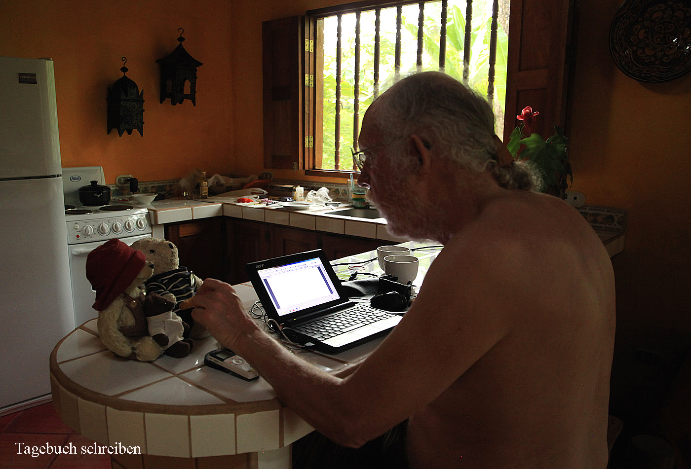 Gegen 16:00 h stand eine leckere Pasta und ein Avocado- Tomatensalat auf dem Tisch, bzw. der kleinen Bar, die die Küche vom übrigen Wohnraum trennte. Wir tranken ein Bier dazu, während es draußen so langsam mit dem Regen aufhörte. Nach dem Essen setzten wir uns mit unseren Netbooks auf die Terrasse und surften ein wenig im Internet. |
