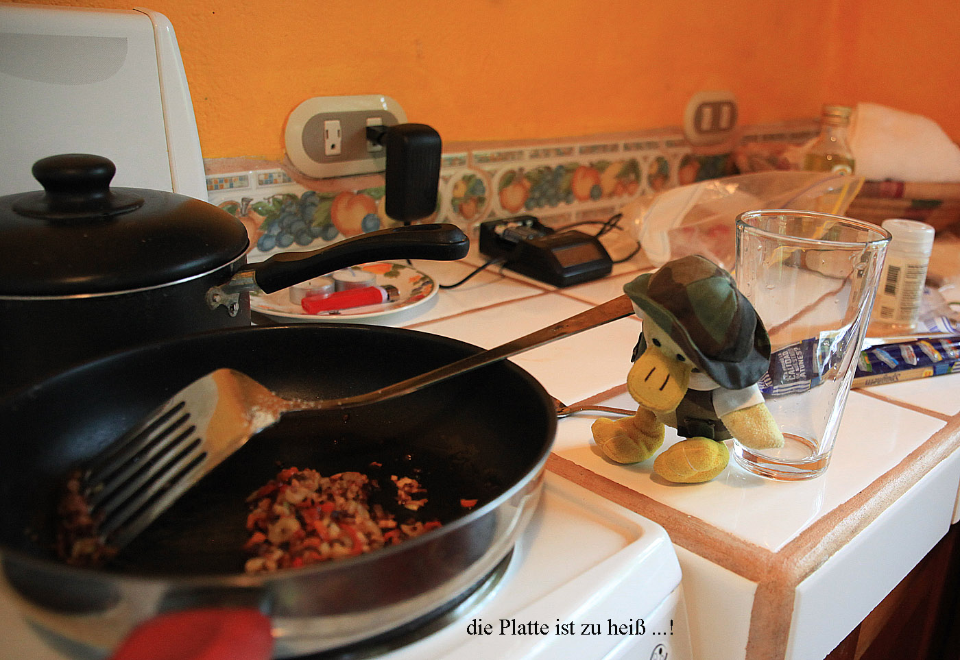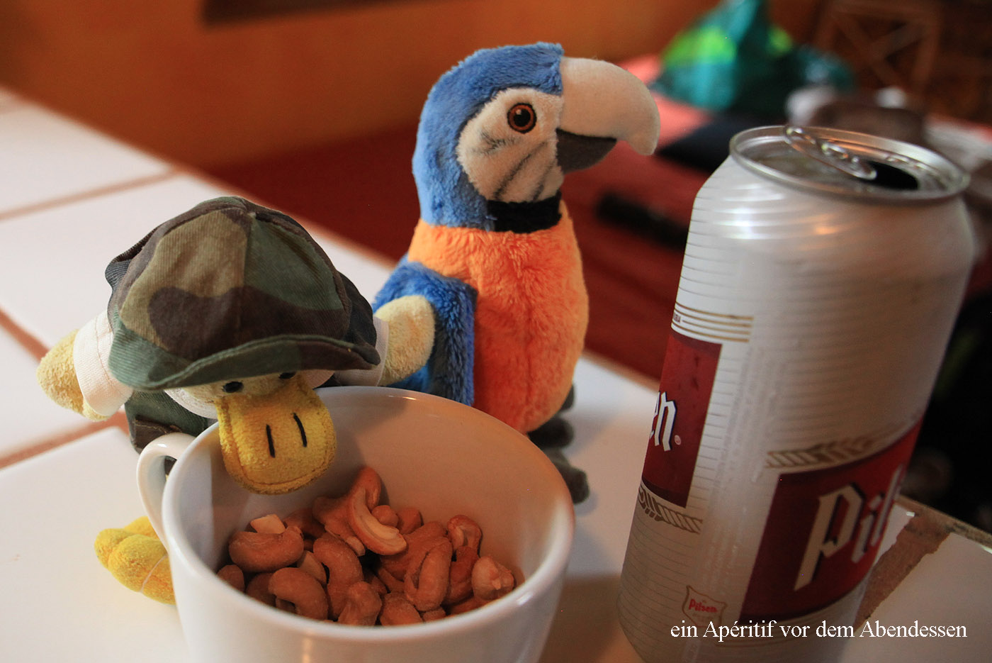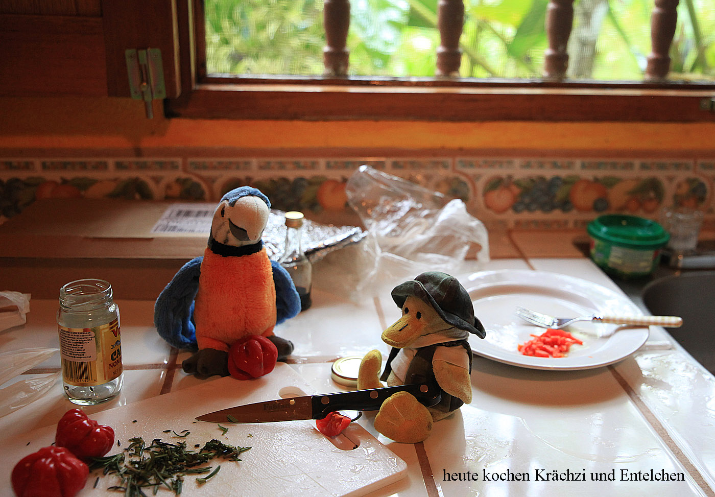 Tomoko fing derweil schon mal an zu kochen, wobei Entelchen und Krächzi fleißig halfen. Die beiden hatten sich einen Apéritif redlich verdient... |