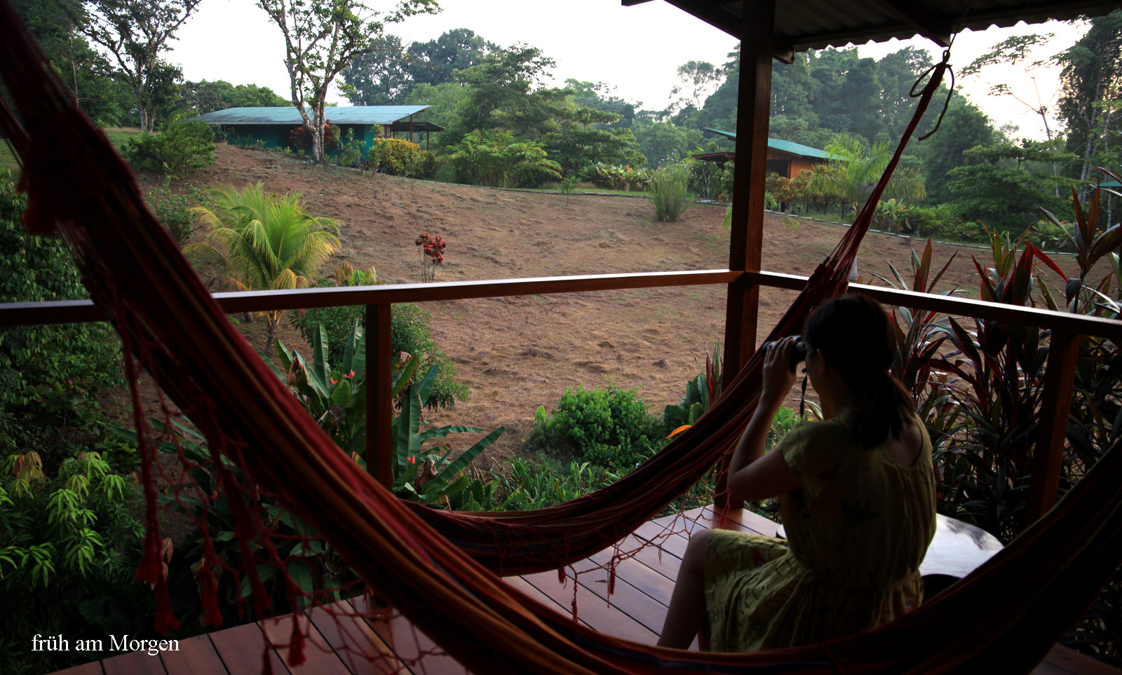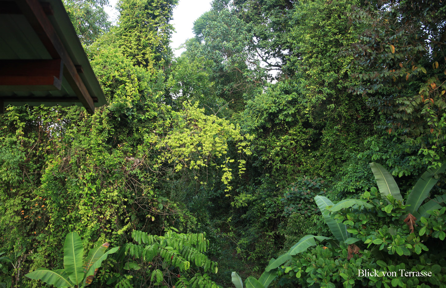 Tomoko wurde gegen 5:00 h wach, ich erst um 5:30 h. Wir hatten beide gut geschlafen. Die Temperatur im Zimmer war sehr angenehm mit 24°. Wir setzten uns auf die Terrasse, schauten in den beginnenden Morgen und lauschten den zahlreichen Vogelstimmen. Der Himmel war noch wolkenlos. |