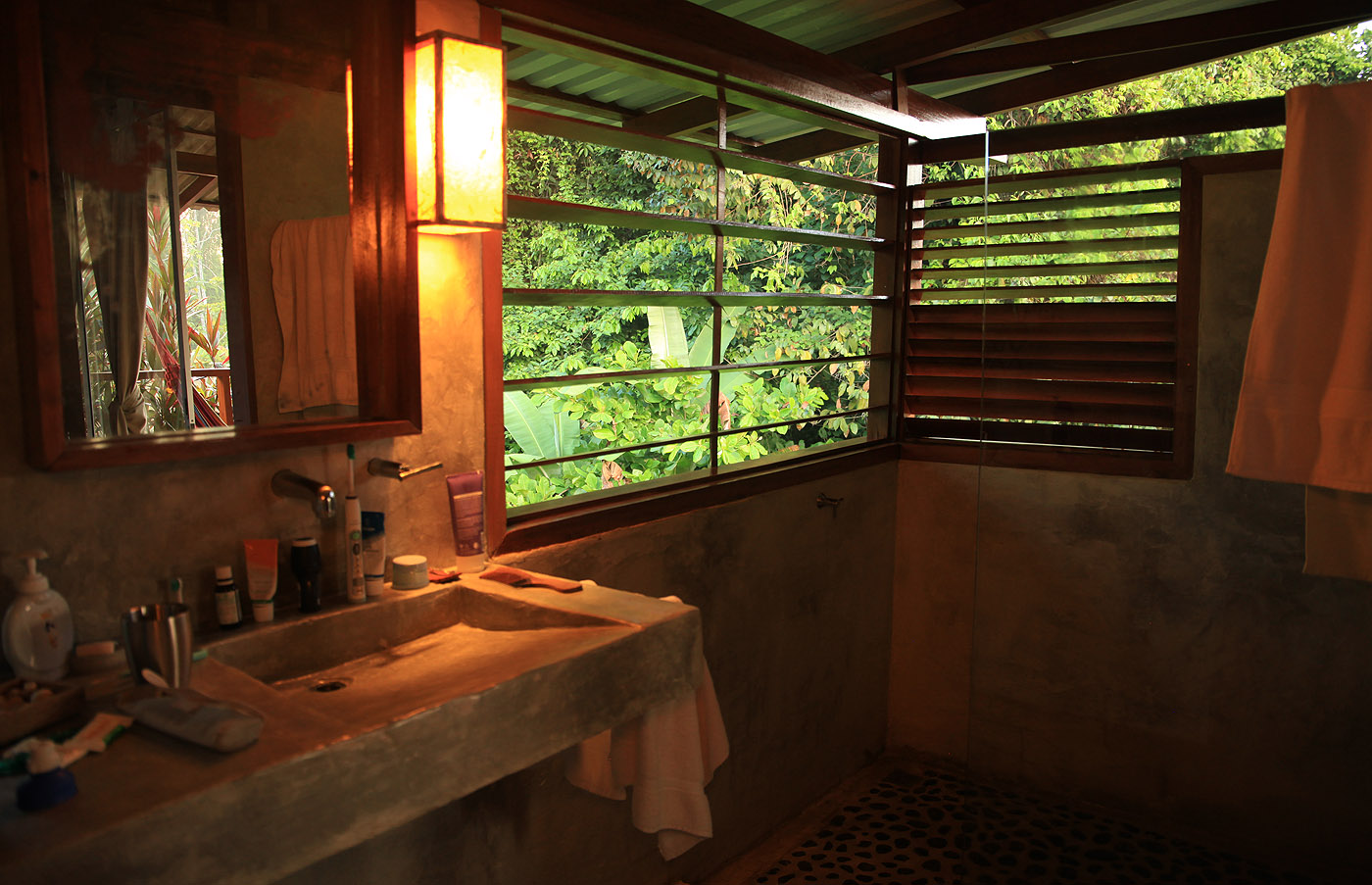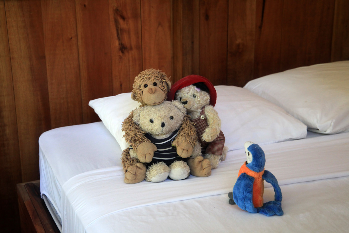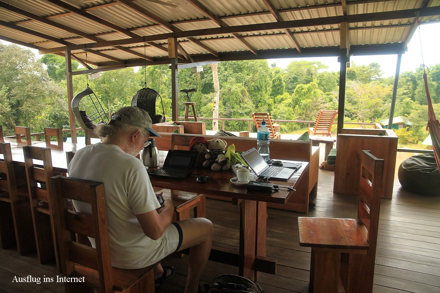 Nun fuhren wir aber endlich zurück zur Finca Maresia. Unser Zimmer war schon gemacht und das Zimmermädchen hatte unsere Tiere in einer netten Gruppe gemeinsam auf meinem Bett positioniert. Wir zogen unsere total verschwitzten Klamotten aus und erfreuten uns an einer erfrischenden Dusche. Ein wenig ruhten wir in den beiden Hängematten aus. Gegen Mittag gingen wir mal rauf auf den „Feldherrenhügel“, wo sich die Rezeption und die Küche befinden. Ich bestellte mir zur großen Freude der Bären ein Bananeneis, Tomoko aß ein Käsesandwich. Dazu tranken wir einen wie immer sehr starken Kaffee. Wir hatten unsere Netbooks mitgebracht. Ich schaute Emails und etwas Internet und fing dann mit meinem Reisebericht an. Tomoko hatte etwas Probleme mit ihrer Computermaus und ging nach einer Weile wieder zurück zum Zimmer. Ich folgte wenig später. Hier verbrachten wir den ganzen Nachmittag bei 33° im Zimmer, mal etwas schlafend , dann wieder in unseren Hängematten schaukelnd. Der Himmel war inzwischen bedeckt, doch außer einem fernen Grollen, das auf ein Gewitter hindeutete, passierte nichts. Es blieb weiterhin trocken. |