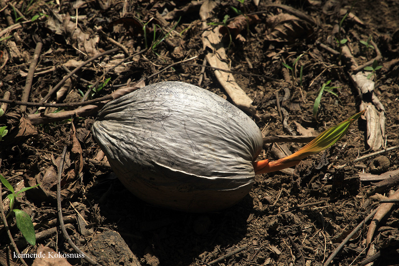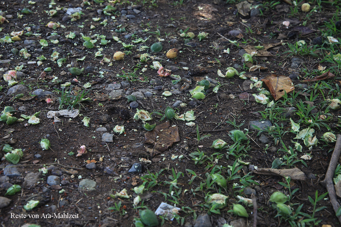 Um 7:20 h fuhren wir los ins Dorf Drake Bay Richtung Strand. Wir parkten das Auto unter einem schattigen Baum nahe einer Schule. Am Boden entdeckten wir heruntergefallene Mandelreste. |