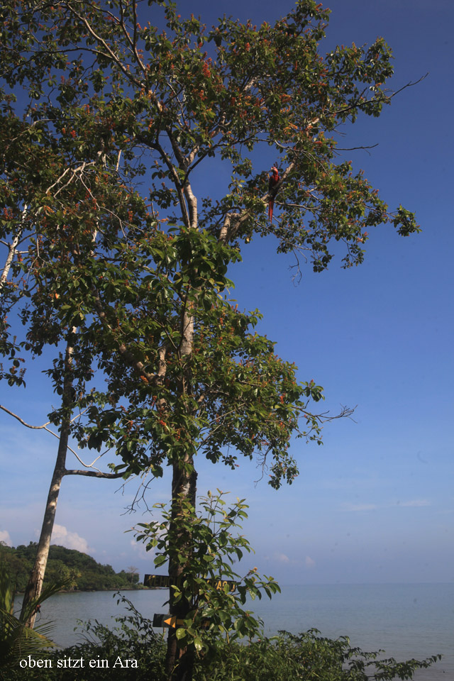 Am Auto angekommen, saßen wieder zwei Rote Aras malerisch in einem Baum direkt am Strand. Obwohl ziemlich erschöpft, wollte Tomoko unbedingt noch ein paar Fotos machen. Dabei stand sie fast 20 Minuten in der prallen Sonne, was sicherlich ihre später auftretende Migräne begünstigt hatte. |