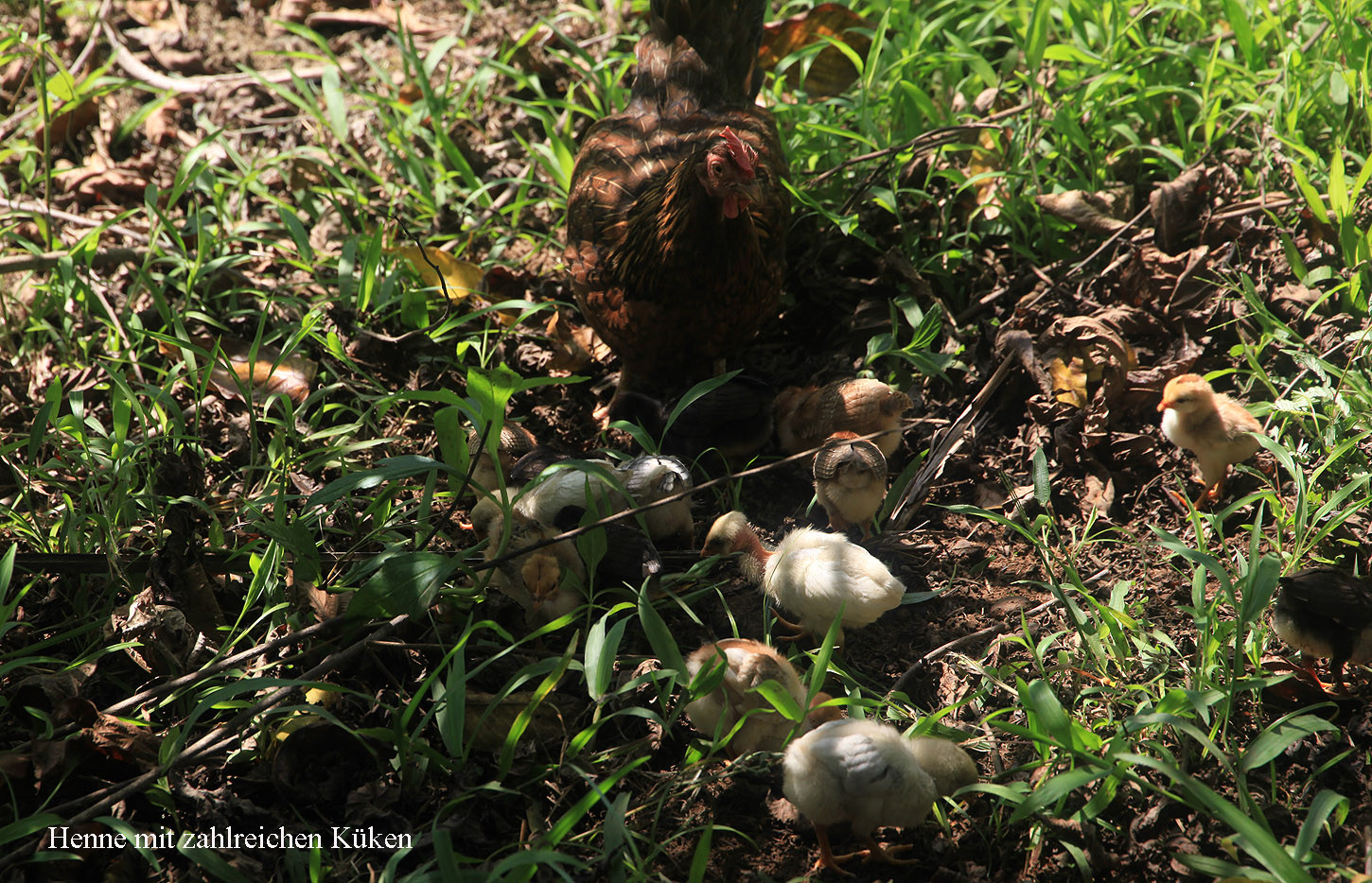 Wir gingen um die kleine Lagune herum. Dabei mussten wir eine niedrige schwankende Hängebrücke überqueren. Als Tomoko gerade in der Mitte der Brücke war, öffnete sich plötzlich ihr Rucksack und ihre Regenjacke sowie Wasserflaschen fielen heraus. Während die Wasserflaschen auf der Brücke liegen blieben, fiel die Regenjacke ins Wasser. Tomoko gab mir ihr Einbeinstativ. Es gelang mir damit die Jacke wieder aus dem Wasser zu fischen. Gleich neben uns scharrte ein Huhn mit zahlreichen jungen Küken kräftig am Boden zwischen heruntergefallenen Kokosnüssen und pickten eifrig. |