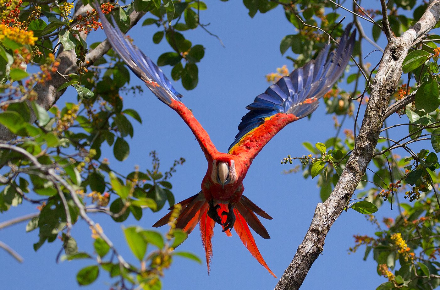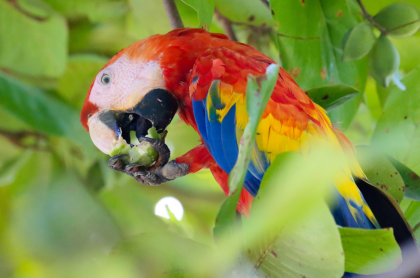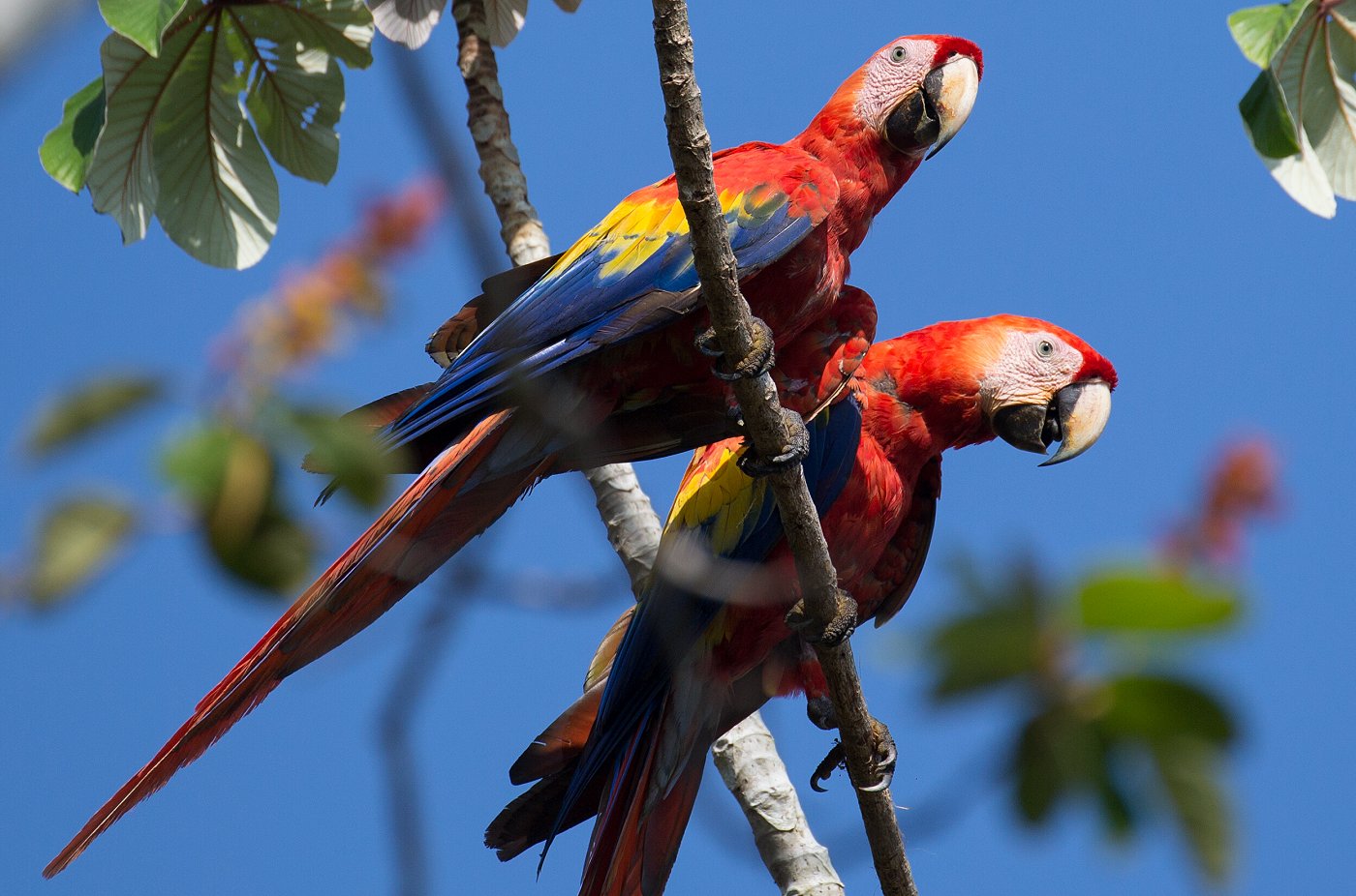Ein kräftiges Krächzen zeigte uns an, dass Rote Aras in der Nähe waren. Als wir nach oben blickten, sahen wir zwei Ara-Paare ganz niedrig in einem wilden Mandelbaum sitzen, die fleißig an den noch ganz grünen Früchten pickten. Einmal fiel mir sogar ein Stück Mandel auf den Kopf. |