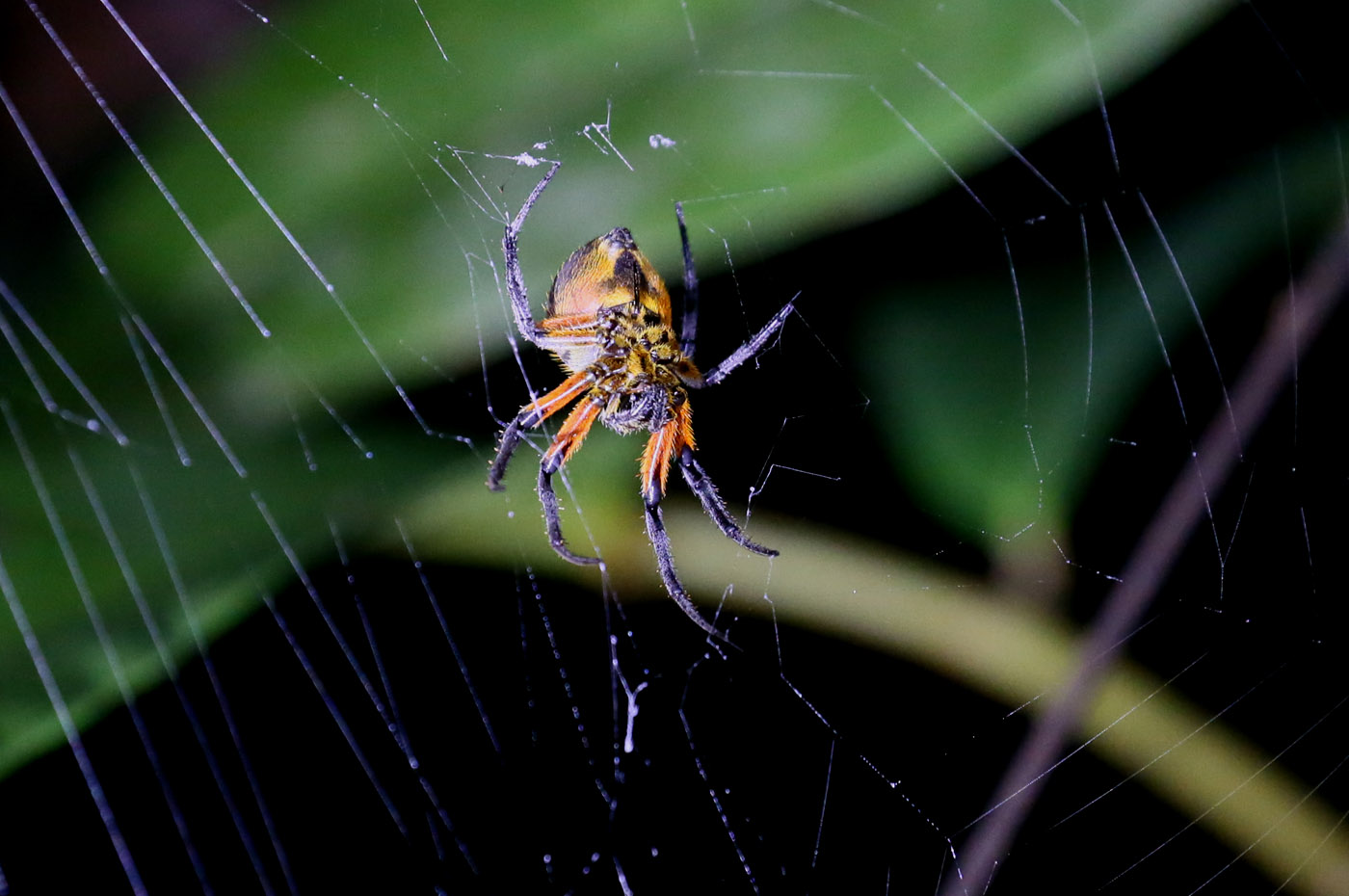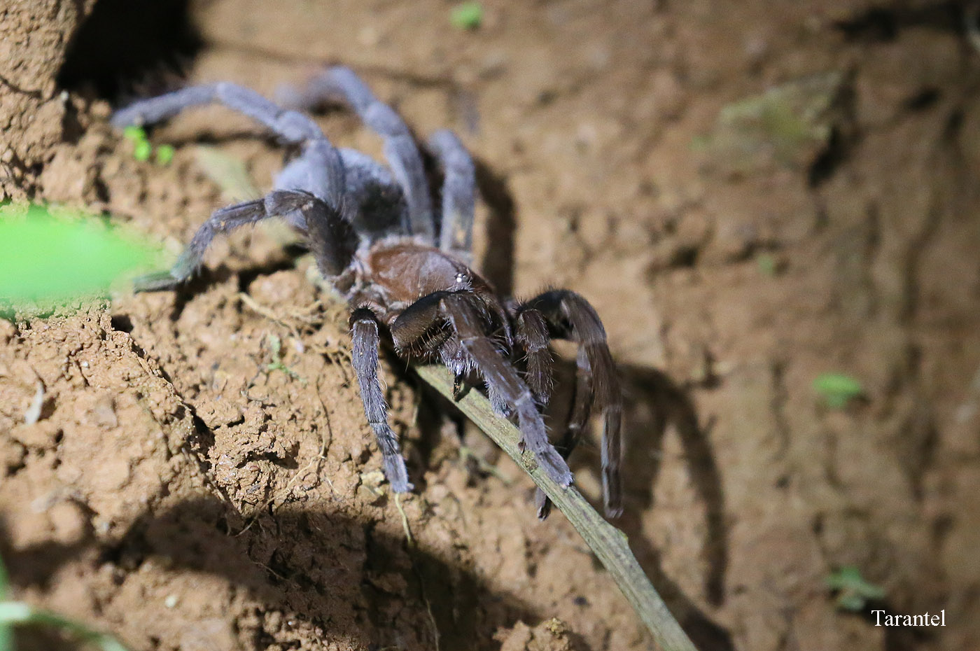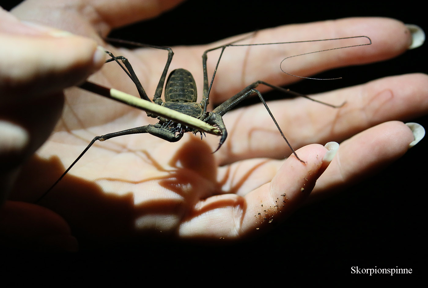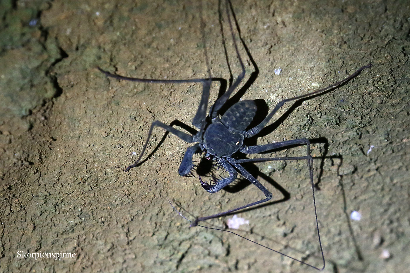 Irgendwo im Dunkeln mussten wir ein Boot besteigen und ein kleines Stück die Küste entlang fahren. An einem Bootssteg stiegen wir aus und wurden von Tracie begrüßt. Zunächst erhielt jeder eine Stirnleuchte, die man auf Rotlicht umschalten konnte, wenn es erforderlich wurde. Tracie erzählte uns viel Interessantes, besonders über Spinnen, was wohl ihr Spezialgebiet ist. Sie und Gian suchten mit ihren Taschenlampen immer abwechselnd nach Tieren, die sie uns zeigten. |