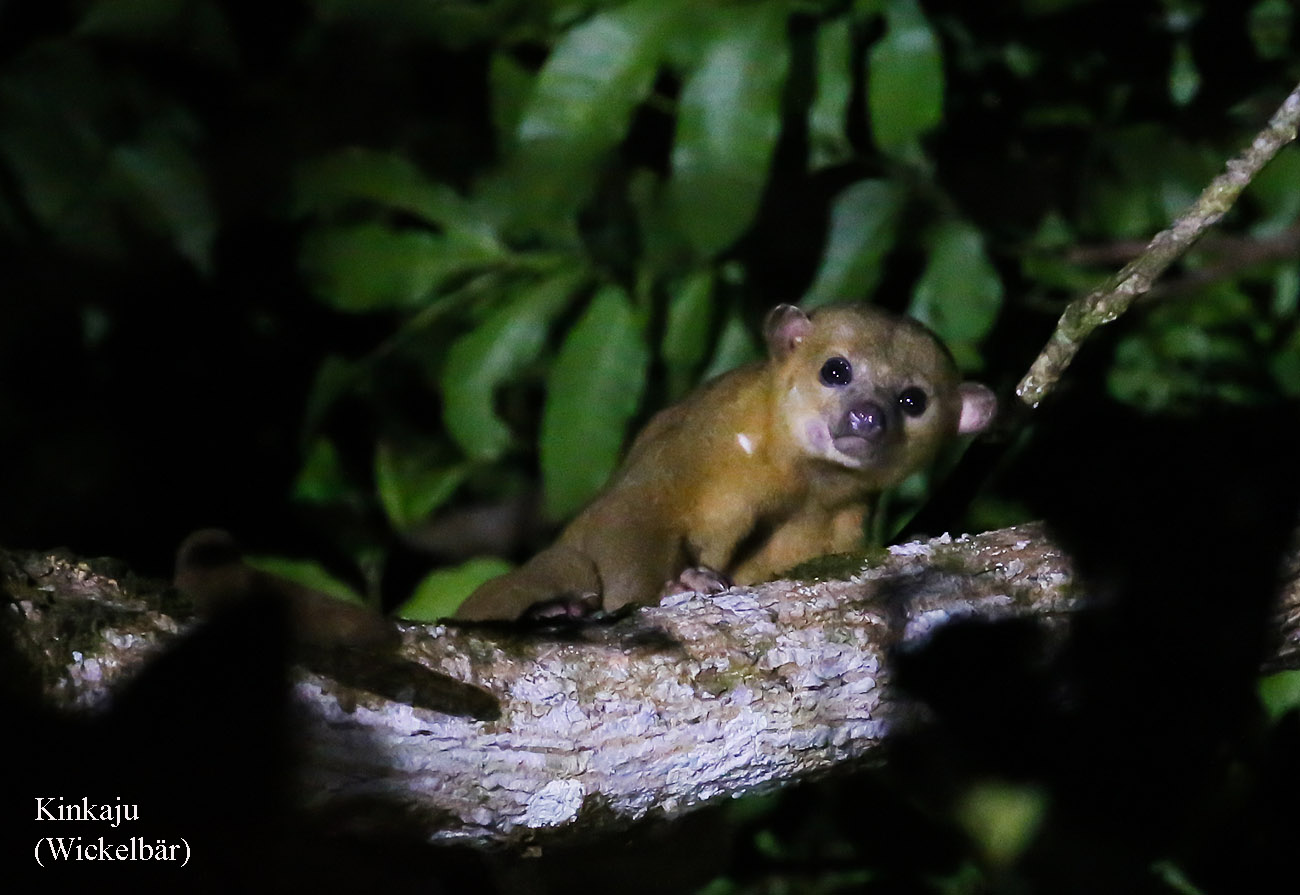 Ein Opossum huschte über uns hinweg. Ganz hoch in einem Baum konnten wir einen Kinkaju (Wickelbär) sehen. Eine besonders große Kakerlake nahm Tracie in ihre Hand, ebenfalls einige Spinnen. |