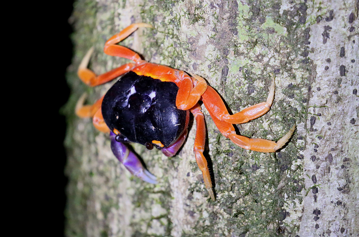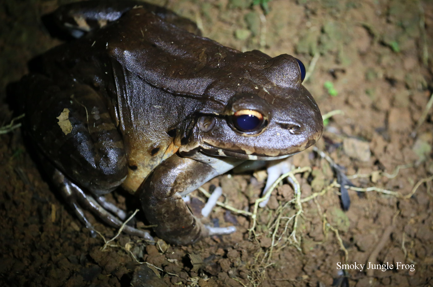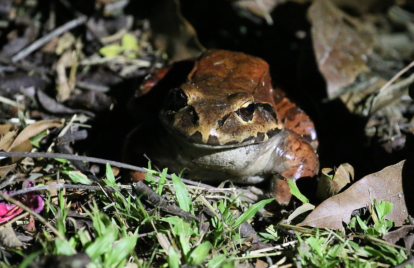 Tomoko hörte um kurz nach 16:00 h einige Aras krächzen. Sie nahm ihre Kamera und ging alleine los in die Richtung, aus der sie das Krächzen hörte. Heute hatten wir eine Nachtwanderung mit Tracie "The Bug Lady", einer Expertin für Nachtführungen im Dschungel, gebucht, die um 19:00 h unmittelbar ans Abendessen anschloss. Also mussten wir zum Essen schon in entsprechender Kleidung erscheinen, lange Hose, langärmeliges Hemd, hohe Schuhe usw… Da wir 6 Personen waren, fuhren wir mit 2 Autos runter ins Dorf, wo wir uns um 19:30 h mit Tracies Mann Gian trafen, der uns zu Tracie bringen sollte, die an einer anderen Stelle auf uns wartete. Wir marschierten im Dunkeln los ein Stück am Strand entlang Richtung Westen. Wir sahen dabei einige Frösche. |