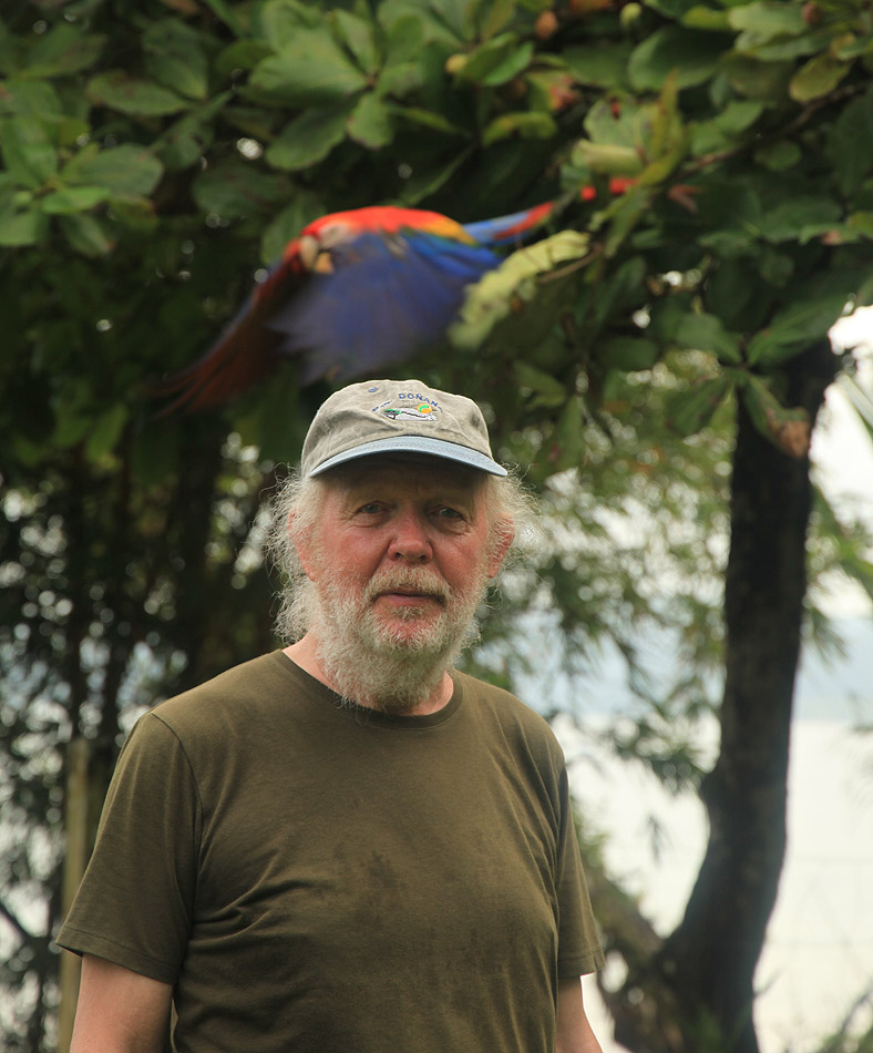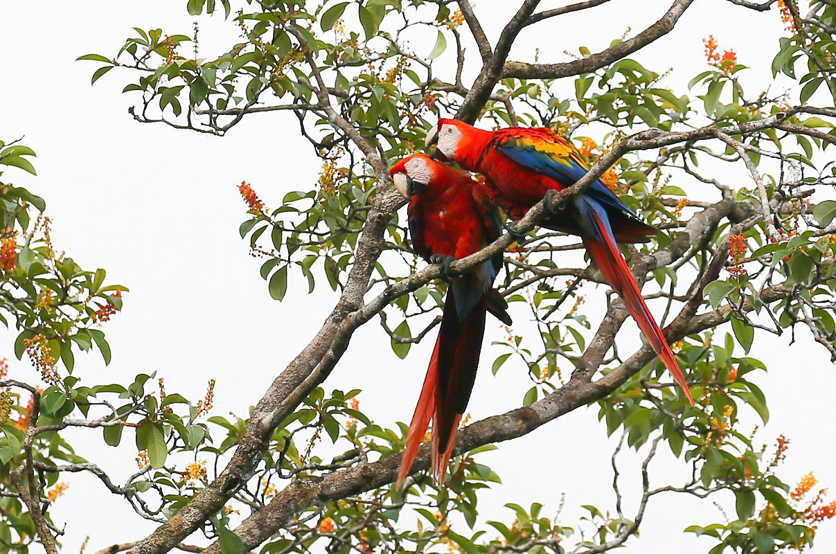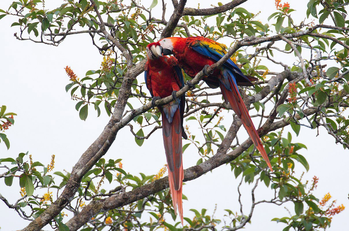 Eine nette einheimische Frau deutete auf einen Baum, in dem wieder 2 Lapas (Rote Aras) genüsslich grüne Mandel-Früchte verzehrten. Am heutigen Samstag war die Schule geschlossen, das Tor zum Schulgelände stand aber offen. Wir gingen hinein auf die grüne Wiese, die als Sportplatz dient. Von hier hatten wir einen guten Blick auf die Aras. |