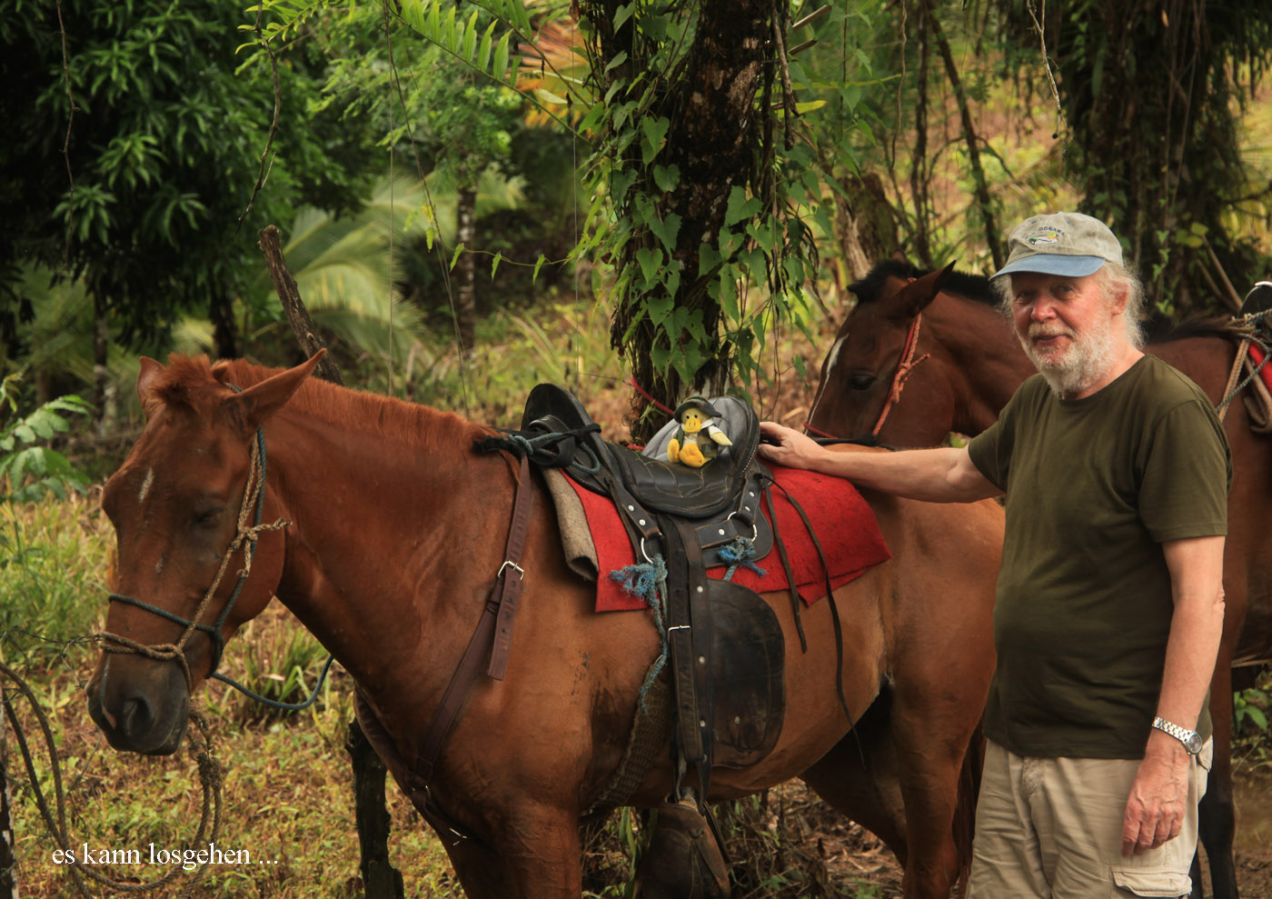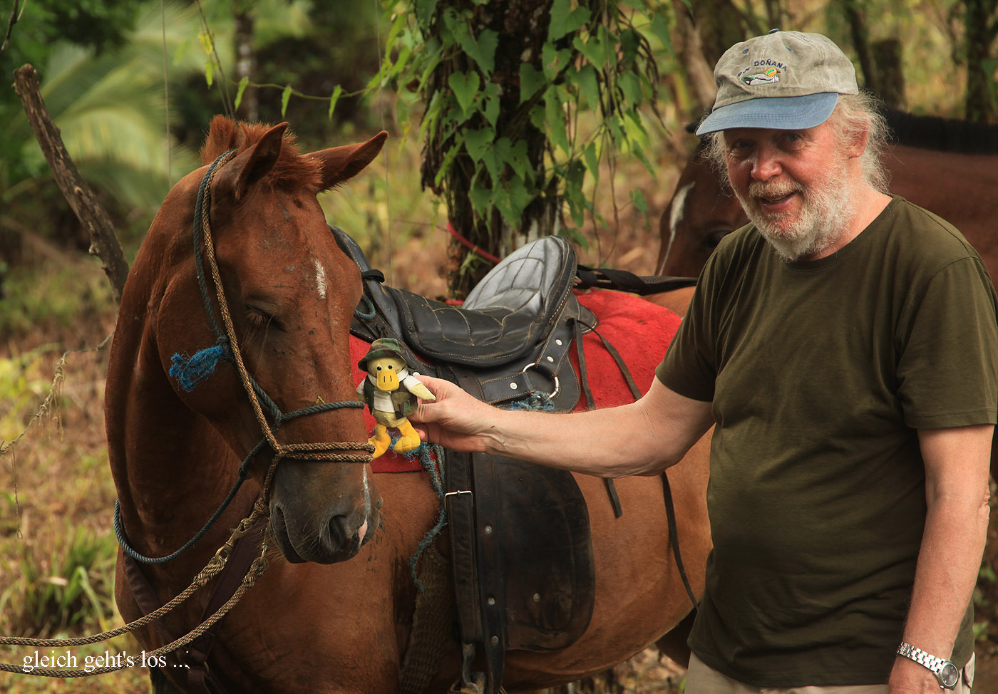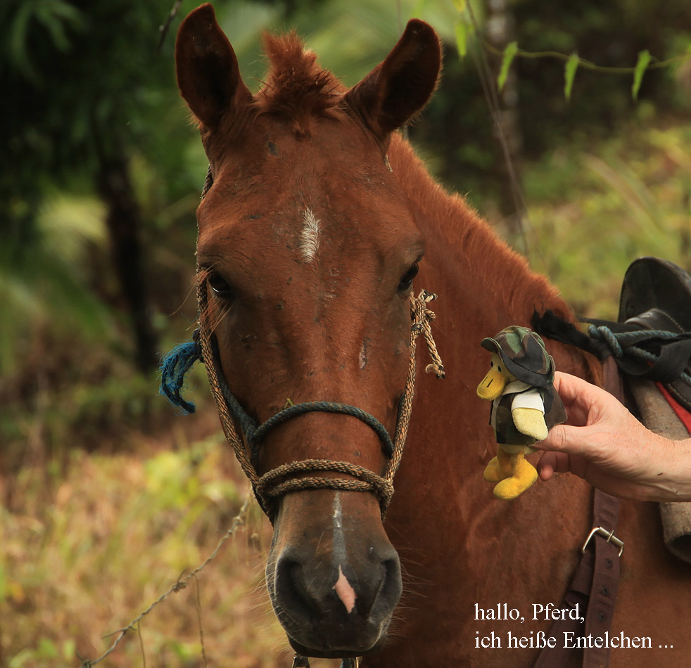 Um 8:00 h wurden wir langsam hungrig und fuhren zum Frühstück zurück. Als wir bei der Finca Maresia ankamen, warteten am Eingang drei gesattelte Pferde. Da die Gäste, die einen Ausritt gebucht hatten, noch nicht da waren, probierte Entelchen mal zu reiten. |