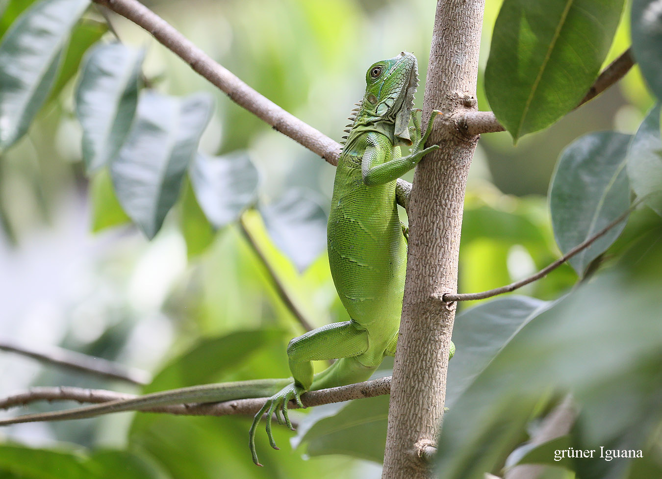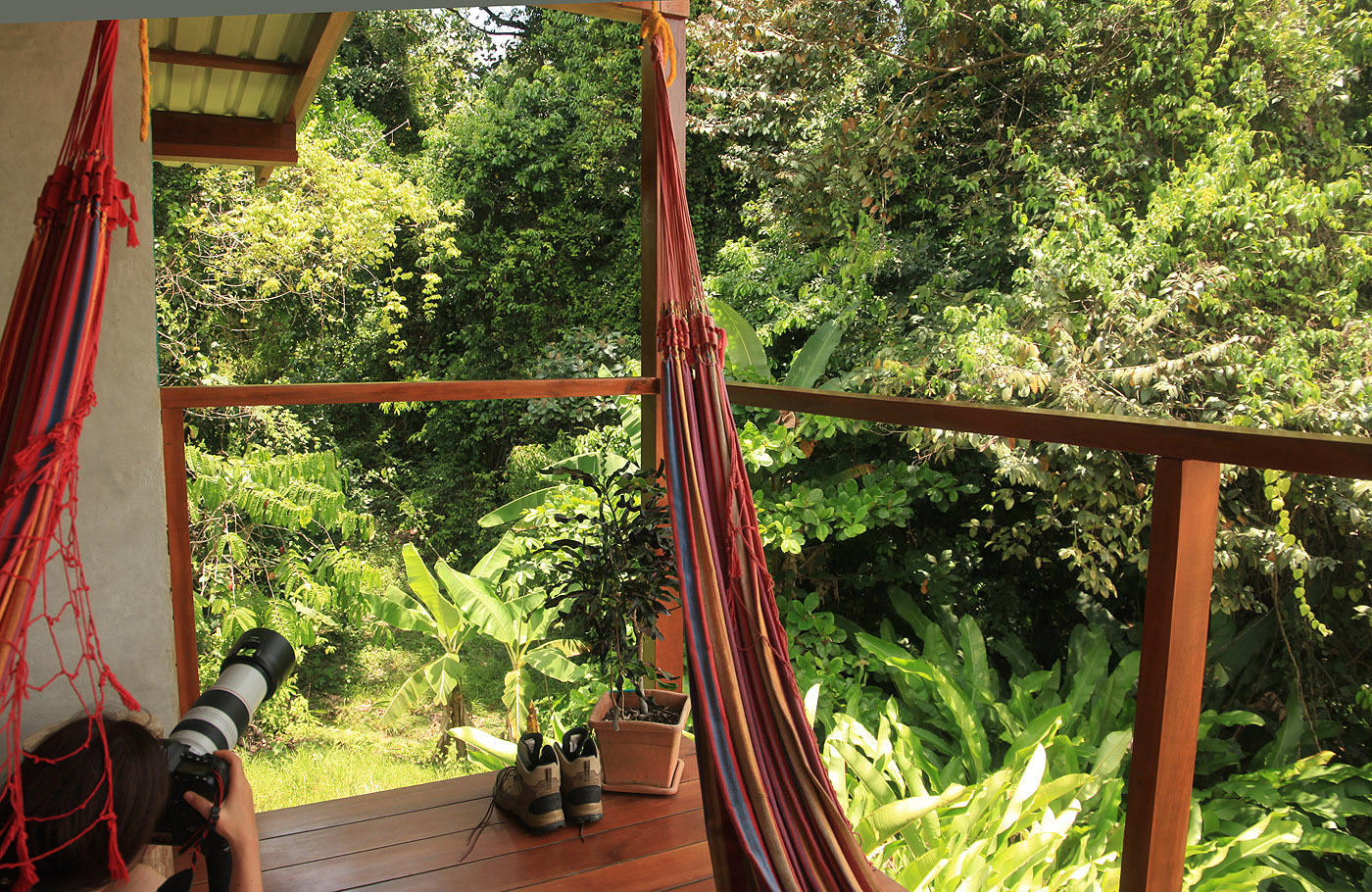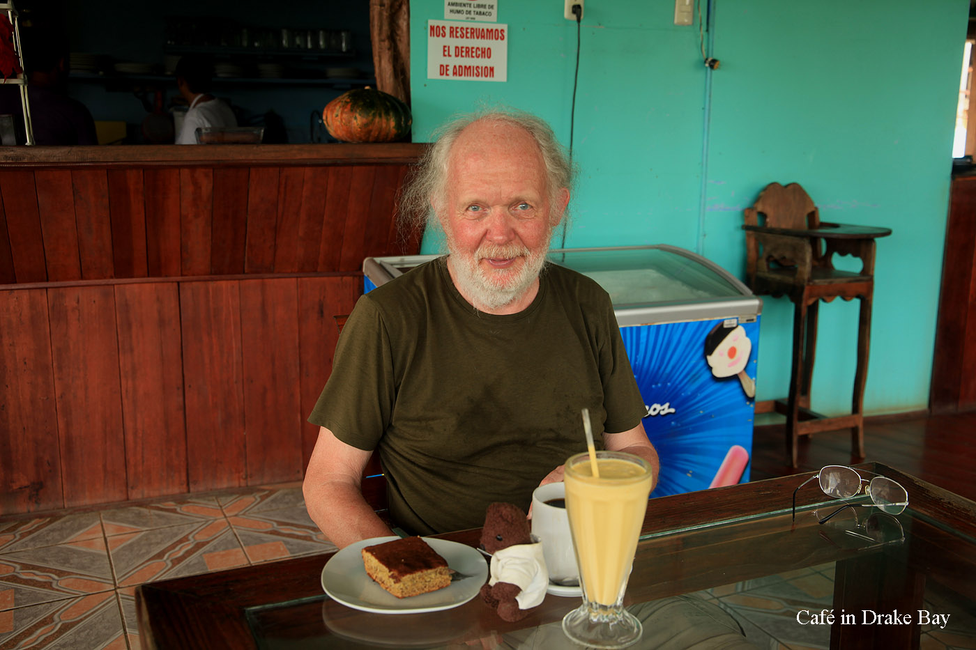 Um 13:00 h fuhren wir mit dem Auto mal rechts heraus aus der Finca einen kleinen Weg den Berg hinunter. Es waren zwar nur! 33° im Schatten, aber da die Sonne fast senkrecht über uns stand, war es in der Sonne wahnsinnig heiß. Gott sei Dank sorgte unsere Klimaanlage im Auto schnell für angenehmere Temperaturen. Der Weg endete nach ca. 1 km an einem Fluss, den man wieder hätte durchqueren müssen. Dazu hatte Tomoko aber keine Lust. Stattdessen fuhren wir zurück hinunter ins Dorf. In einer kleinen Soda (Restaurant) nahmen wir Platz. Ein freundlicher junger Mann wies uns gleich einen Platz auf der Terrasse zu, von dem wir einen schönen Ausblick in seinen Garten und die nähere Umgebung hatten. Tomoko entdeckte sofort einen kleinen grünen Leguan (Iguana) direkt neben uns in den Blättern eines Baums. Der Angestellte zeigte uns etwas weiter entfernt noch zwei große Iguanas, ebenfalls in einem Baum sitzend. Auch einige Rote Aras überflogen uns. Ich bestellte ein Stück Bananenkuchen mit einer Tasse wohlschmeckenden Kaffees, während Tomoko einen mit Milch verquirlten Mangosaft trank, der ganz toll schmeckte. So blieben wir eine halbe Stunde dort gemütlich sitzen. |