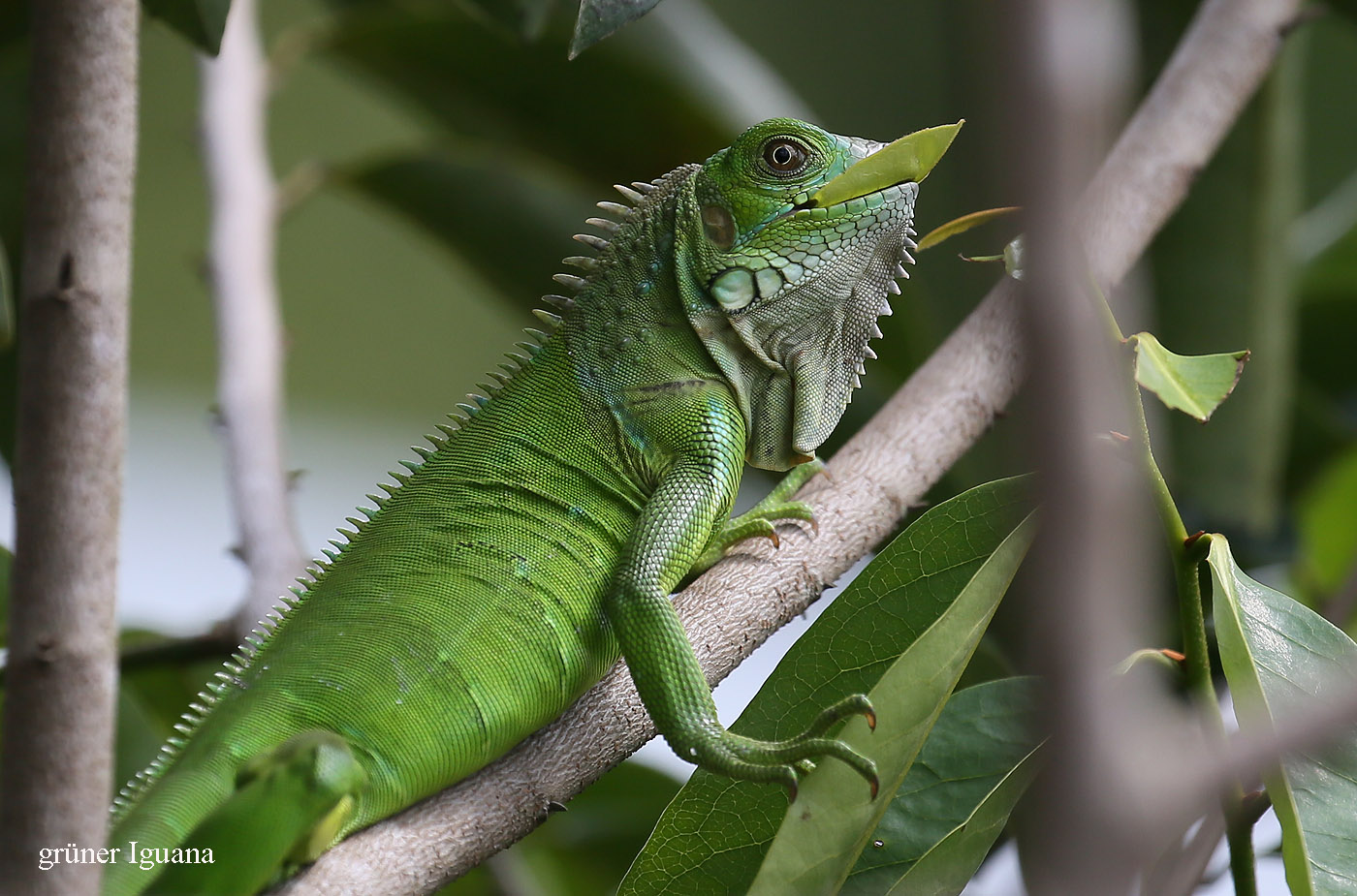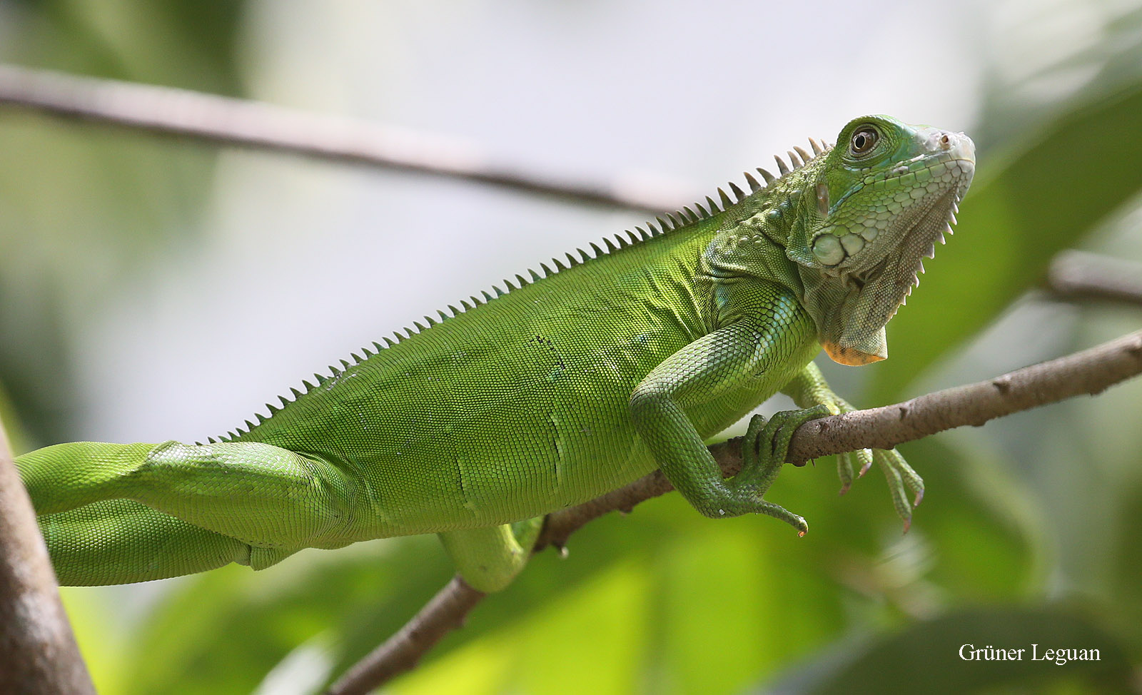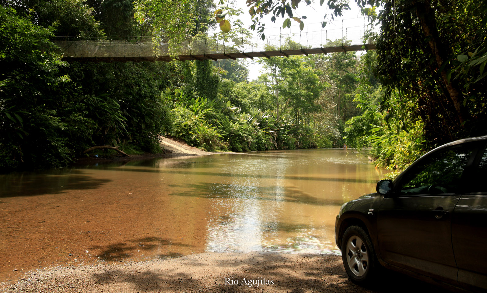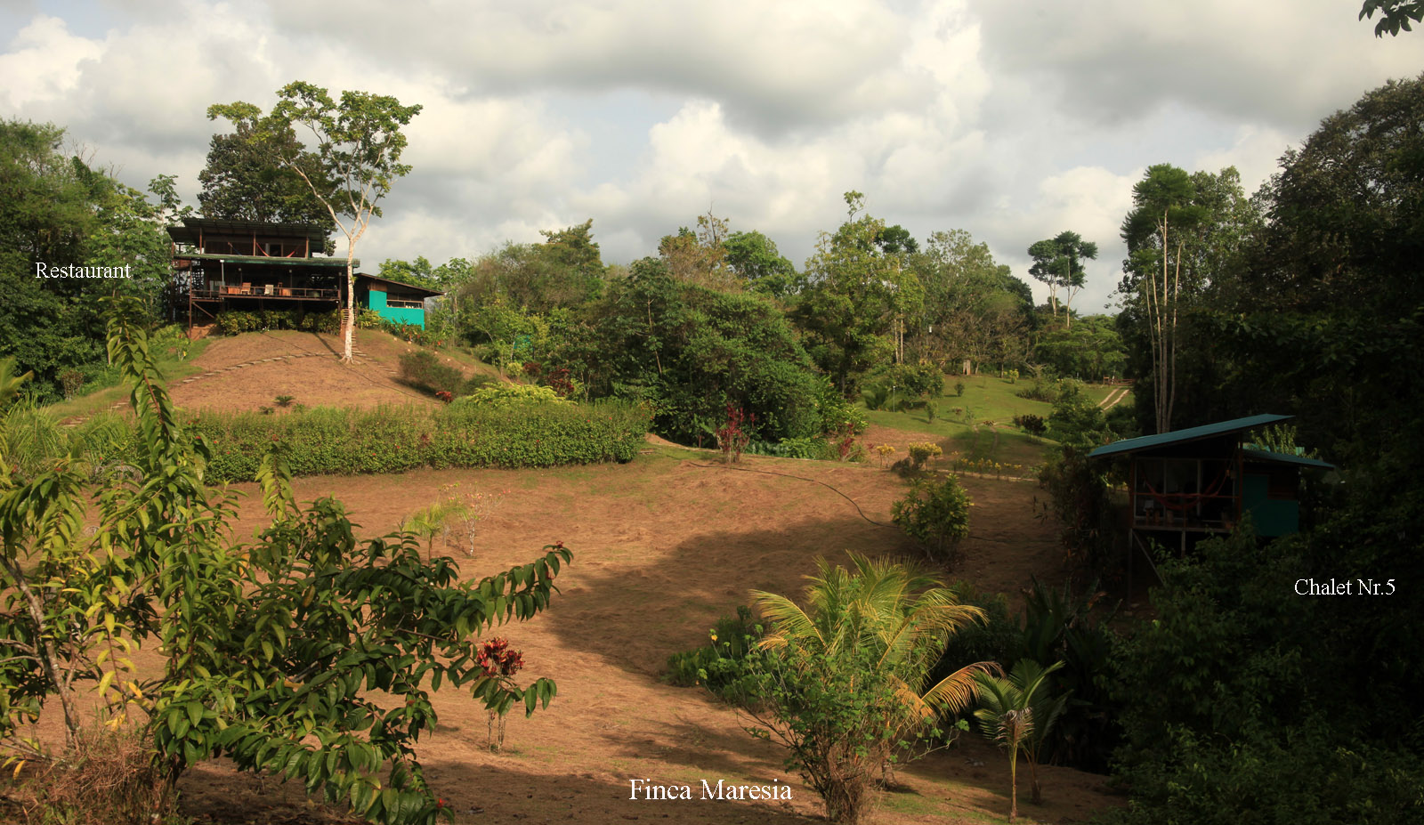 Um 13:00 h fuhren wir mit dem Auto mal rechts heraus aus der Finca einen kleinen Weg den Berg hinunter. Es waren zwar nur! 33° im Schatten, aber da die Sonne fast senkrecht über uns stand, war es in der Sonne wahnsinnig heiß. Gott sei Dank sorgte unsere Klimaanlage im Auto schnell für angenehmere Temperaturen. Der Weg endete nach ca. 1 km an einem Fluss, den man wieder hätte durchqueren müssen. Dazu hatte Tomoko aber keine Lust. Stattdessen fuhren wir zurück hinunter ins Dorf. In einer kleinen Soda (Restaurant) nahmen wir Platz. Ein freundlicher junger Mann wies uns gleich einen Platz auf der Terrasse zu, von dem wir einen schönen Ausblick in seinen Garten und die nähere Umgebung hatten. Tomoko entdeckte sofort einen kleinen grünen Leguan (Iguana) direkt neben uns in den Blättern eines Baums. Der Angestellte zeigte uns etwas weiter entfernt noch zwei große Iguanas, ebenfalls in einem Baum sitzend. Auch einige Rote Aras überflogen uns. Ich bestellte ein Stück Bananenkuchen mit einer Tasse wohlschmeckenden Kaffees, während Tomoko einen mit Milch verquirlten Mangosaft trank, der ganz toll schmeckte. So blieben wir eine halbe Stunde dort gemütlich sitzen. |