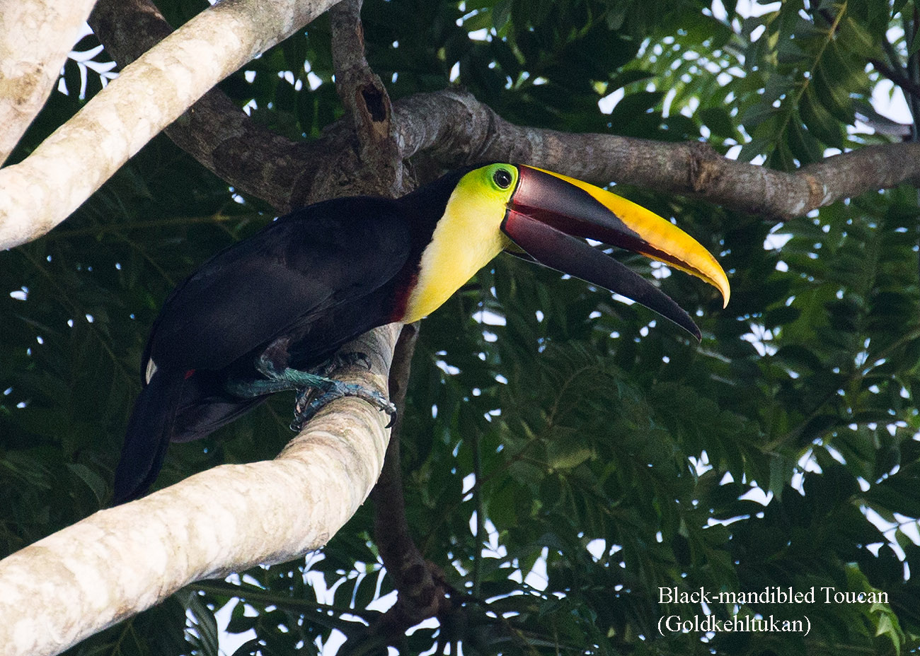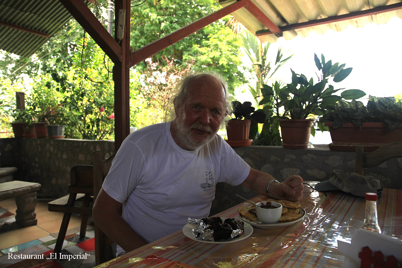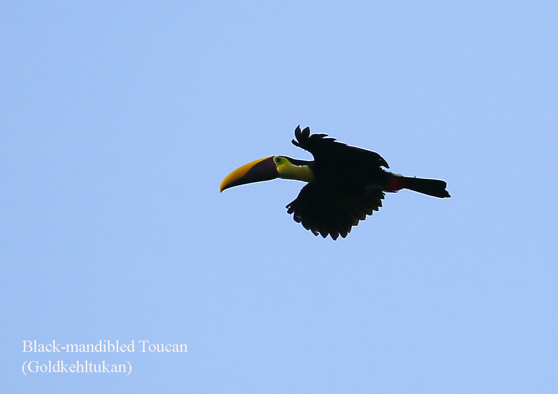 Wir fuhren nochmals runter an den Strand. Bei der Schule, wo wir in den letzten Tagen geparkt und die Roten Aras gesehen hatten, war am heutigen Montag Unterricht. Von allen Seiten kamen Eltern herbei, die ihre Kinder zur Schule brachten. Vielleicht waren deshalb heute morgen keine Aras vor Ort zu sehen. Also fuhren wir wieder zurück und frühstückten erst mal. Cécile und Nicolas, die heute früh abfahren wollten, saßen schon da als wir kamen. Wir unterhielten uns noch eine Weile sehr nett, bevor die beiden die Lodge in ihrem Auto verließen. Wir gingen nach dem Frühstück in unseren Bungalow zurück und packten unsere Sachen zusammen, da wir ebenfalls heute abreisen wollten. Nach einer Weile kam Juan ziemlich aufgeregt zu uns und bat darum, dass wir schnell die Abrechnung durchführen , da er dringend etwas zu erledigen habe. Ich ging ihm nach zur Rezeption und da erfuhren wir, dass Cécile und Nicolas sich auf der Strecke nicht weit von Drake Bay mit ihrem Auto überschlagen hatten und seine Hilfe benötigten. Ziemlich unter Schock bezahlte ich unsere Gesamtrechnung und ging zum Bungalow zurück. Schnell packten wir den Rest unseres Gepäcks zusammen und fuhren um 9:40 h los. Kurz hinter Drake sahen wir dann die Unfallstelle. Auf einem 300 m langen schnurgeraden Stück der unbefestigten Straße hatte Nicolas wohl bei Gegenverkehr einen kleinen Felsblock am Straßenrand gerammt. Da er sicherlich ziemlich schnell unterwegs war, platzte ein Reifen und er landete kopfüber in einem kleinen Bachbett. Wie die beiden aus dem total demolierten auf dem Dach stehenden Wrack unverletzt herausgekommen sind, grenzt an ein Wunder. Beide hatten sich soweit gefasst. Juan war bei ihnen und sie warteten auf die Polizei. Wir konnten nichts anderes tun, als die beiden zu trösten. Gott sei Dank war der Schaden am Auto versichert und sie hofften sogar, bald einen Ersatzwagen zu bekommen. Das wird aber sicher noch eine Weile dauern. Wir verabschiedeten uns und fuhren langsam weiter. Die folgenden Flussdurchfahrten machten wir kurz und kommentarlos ohne Fotos. Bei der Brücke mit den zwei schmalen Fahrstreifen hielt ich an. Tomoko überprüfte den Wasserstand, denn man konnte anstatt dieser Brücke auch den Weg durchs Wasser wählen. Als ihr das Wasser fast bis zum Knie reichte, kehrte sie um und ich beschloss, doch die Brücke zu benutzen, was auch problemlos klappte.