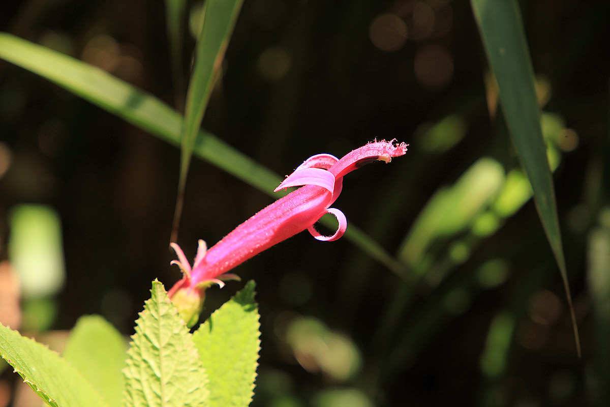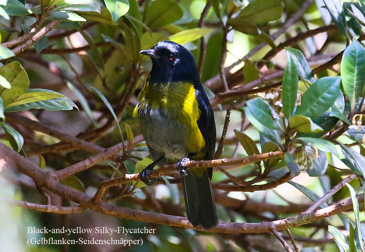 Inzwischen überholten uns mehr und mehr weitere Touristen. Wir gingen aber langsam weiter und versuchten einen der ständig piepsenden Vögel zu erkennen, was in dem dichten Unterholz sehr schwierig war. Von der Lagune führte der Trail in einem etwa 2 km langen Bogen wieder zum Parkplatz zurück. An einer Stelle lief uns ein Black Guan über den Weg, verschwand aber schnell wieder im Dickicht. Ich fotografierte viele Blüten und Pflanzen am Wegesrand. Einen für uns neuen Vogel entdeckte Tomoko, einen Black-and-Yellow Silky-Flycatcher. |