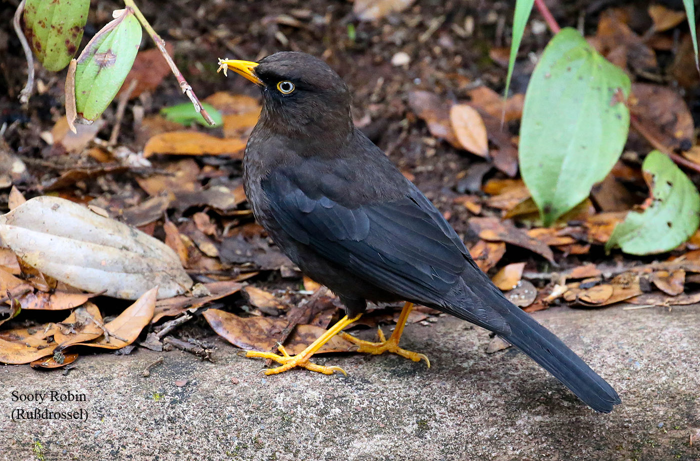 Der letzte km des Trails ging steil abwärts, was meine Knie wieder schmerzen ließ, so dass mir Tomoko ihr Einbeinstativ als Stütze überließ. Damit ging der Abstieg wirklich um einiges leichter. Gegen 10:30 h erreichten wir wieder den Parkplatz. Hier hüpfte ein amselähnlicher Vogel, ein Sooty Robin, herum. |