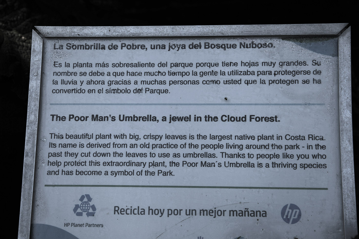 Gegen 5:00 h weckte uns der Gesang der Vögel. Wir blieben aber noch eine Weile liegen und gingen erst um 6:00 h zum Frühstück. Es gab wie schon vor 4 Wochen Gallo Pinto mit Rührei und Kochbananen, sowie Obst, Bananen, Ananas und Mangos. Die Mangos waren allerdings noch ziemlich unreif, während die Ananasscheiben hervorragend schmeckten. Wir blieben nicht allzu lange, da wir früh zum Vulkan Poás fahren wollten. Das Wetter war super, strahlend blauer Himmel und keine Wolken, ideal für unser Vorhaben. Beinahe hätte ein Unfall auf der Strecke unsere Pläne zunichte gemacht. Ein Bus war mit einem entgegenkommenden Lkw kollidiert und die Straße war blockiert. Ein wohl ortskundiger Einheimischer vor uns bog in eine Nebenstraße ab und auf einigen verschlungenen Pfaden kamen wir tatsächlich nach einem guten km wieder auf die Hauptstraße zurück. Kurz vorher hatten wir schon einen weiteren Unfall auf der Gegenspur passiert, der auf der Gegenfahrbahn im Berufsverkehr einen langen Stau verursachte. Die Straße stieg mehr und mehr an. Die Entfernungsangaben waren teilweise sehr wiedersprüchlich, mal hieß es noch 10 km bis Poás, etwas später 35 km, schon ein Unterschied... Nachdem wir die letzten Dörfer hinter uns gelassen hatten, fuhren wir durch grüne Wiesen mit Kühen immer höher hinauf. Die Strecke erinnerte ein wenig ans Allgäu oder die Schweiz. Um 7:55 h versperrte plötzlich ein geschlossenes Tor die Straße. Hier war der Eingang zum Nationalpark Poás, der erst um 8:00 h öffnete. Das hatten wir gar nicht bedacht, so waren wir froh, als zweites Auto vor dem Eingang zu stehen. Kurz darauf kam auch ein Auto mit 2 Rangern, die das Tor öffneten. Nach weiteren 2 km erreichten wir eine Stelle, wo man den Eintritt von 15,- $ pro Person plus Parkplatzgebühr von 3,- $ zahlen konnte. Dahinter begann ein ziemlich großer Parkplatz, auf dem unseres und das zweite Auto ziemlich verloren da standen. Jetzt waren es nur noch 400 m Fußweg bis zum Kraterrand. An diesem Weg standen etliche großblättrige Pflanzen. Ein Hinweisschild klärte uns auf, dass diese Pflanze wegen ihrer riesigen schirmartigen Blätter auch "Poor Man's Umbrella" , also frei übersetzt "Regenschirm des armen Mannes" genannt wird. |