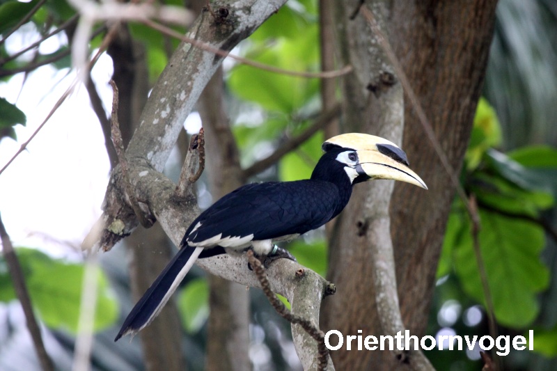 Nach dem Frühstück fuhren wir wieder nach Pulau Ubin. Diesmal wollten wir dort mit dem Fahrrad in Richtung Westen fahren. Kaum hatten wir das kleine Dorf auf der Insel hinter uns gelassen, konnten wir auf einem Baum einen Orienthornvogel (Oriental Pied Hornbill) entdecken. Nach ca. 1km kamen wir an einen kleinen See, wo viele Reiher in den Bäumen saßen. Leider war das Wetter sehr bedeckt und nach einer Stunde kam auch der erste Regen. |