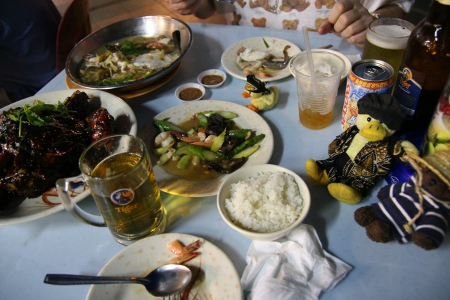 Ganz in der Nähe des Hotels gibt es zahlreiche kleine Restaurants, die fast alle gut besucht waren. Wir wählten ein kleines chinesisches Open-Air-Restaurant. Hier bestellte Tomoko eine große dicke Krabbe in Pfeffersoße. Weiter gab es noch gebratenes Gemüse, einen gedämpften Fisch und natürlich Reis, alles sehr, sehr gut schmeckend, dazu ein kühles Tiger-Bier. Wir gingen danach noch ein wenig spazieren in der lauen Tropenluft und ließen die vielen fremdartigen Eindrücke auf uns wirken. Wir beide lieben dieses tropische Klima. Da ich etwas Schlaf nachholen musste, gingen wir dann aufs Zimmer und träumten erwartungsvoll von den vor uns liegenden Tagen... |