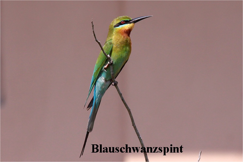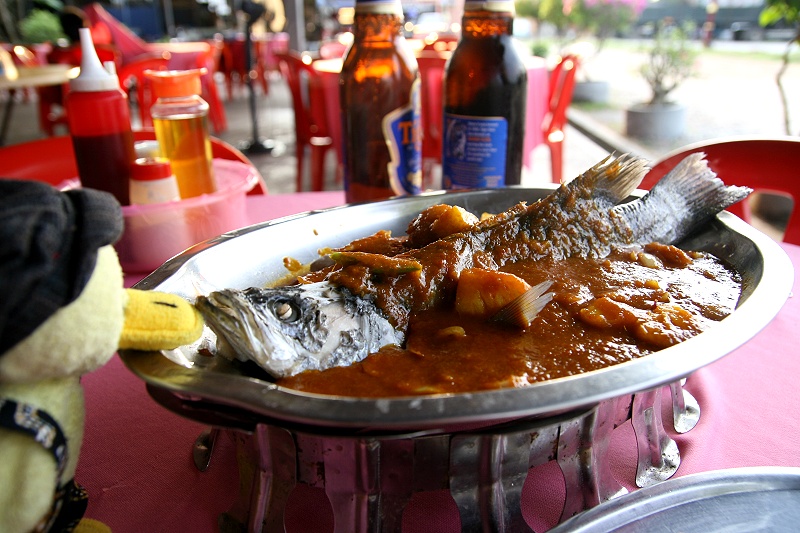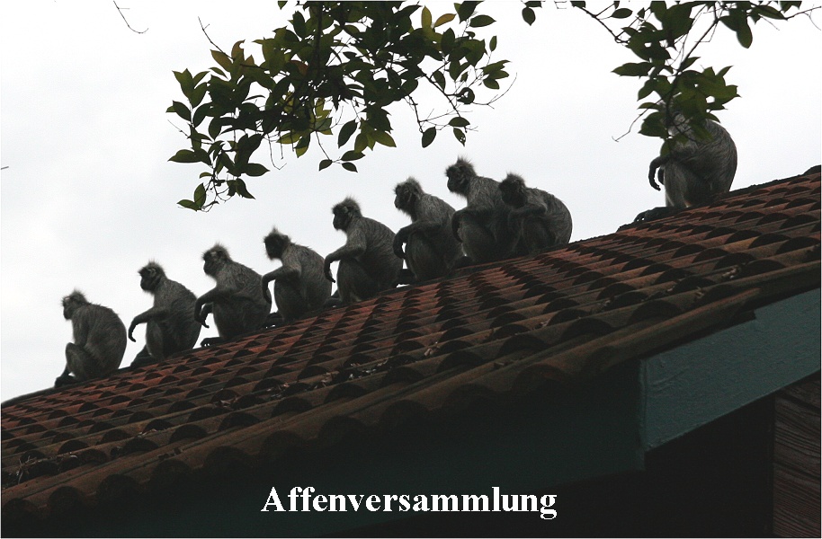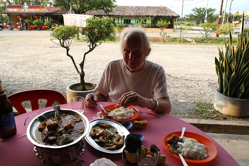 Schnell zum Supermarkt, Wasser und Bier kaufen. Vorher aß Tomoko noch ein leckeres Süppchen, und wir tranken beide einen eiskalten Saft (Mango und Kokosnuss), für mich schon fast zu kalt. Angesichts des herrlichen Wetters verbrachten wir den Nachmittag am Swimmingpool des Hotels. Kein Mensch weit und breit zu sehen, nur ein paar Affen näherten sich neugierig. Also alles sicher im Rucksack verpacken, man weiß ja nie, was die so im Schilde führen…. Wir konnten am Pool noch einen prächtigen Blauschwanzspint, eine Bienenfresserart (Blue-tailed Bee-eater), fotografieren. Nach dem Schwimmen duschten wir, zu Tomokos Verdruss gab es kein warmes Wasser. Zähneklappernd ertrug sie die Prozedur. Zum Abendessen fuhren wir in ein nahe gelegenes Dorf und fanden ein chinesisches Open-Air-Restaurant. Es gab keine Speisekarte, Tomoko konnte aber einige chinesische Schriftzeichen entziffern. So bestellte sie Fisch, Shrimps, Gemüse, Reis und Bier beim Sohn der Familie, der dann seine ältere Schwester zu Hilfe rief. Das Essen war großartig, viel Knoblauch, alles zusammen mit großen Bier 80 Ringgit (ca. 17€). |
