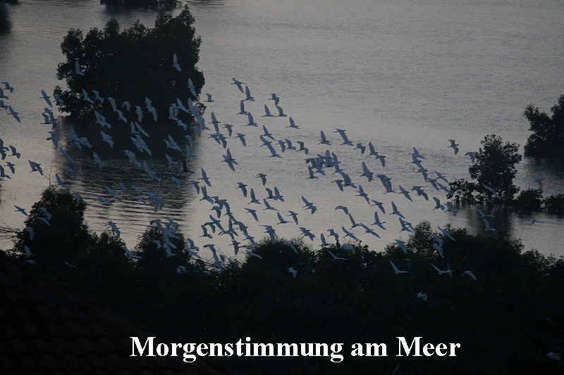 Wir spazierten noch ein wenig und kamen dann zum Abendessen in die Mall zurück. In einem kleinen Restaurant aßen wir Mapo-Tofu, ein thailändisches Reisgericht und eine Nudelsuppe. Ich war begeistert, während Tomoko meinte, dies sei eine ganz normale Kaufhausqualität, na ja….. Wir gingen dann zum Hotel zurück, beobachteten noch ganze Schwärme von weißen Kuhreihern (Cattle Egret), die zu ihren Schlafplätzen in ein nahegelegenes Mangrovenwäldchen flogen. Trotz bedrohlich wirkender schwarzer Wolken blieb das erwartete Gewitter aus. Es regnete nur ein paar Tropfen. Nachts wachte ich mal kurz auf, da ich den Lärm einer nahegelegen Disco hörte, doch Gott sei Dank hörte dieser Lärm bald darauf auf…. |