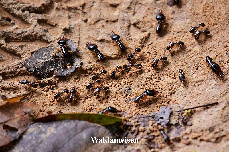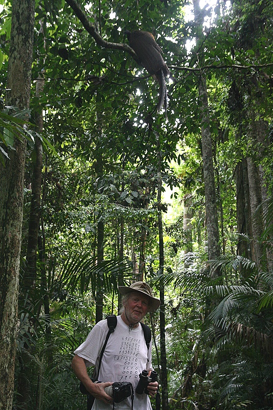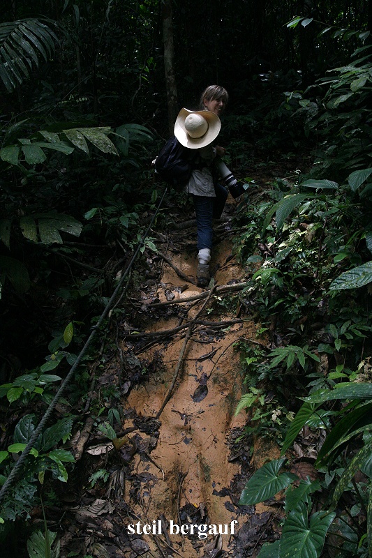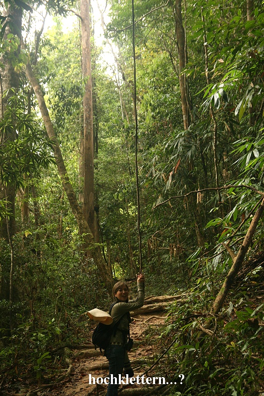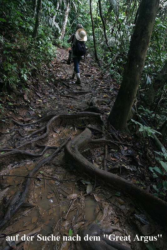 Dann ging es weiter 1,5 km östlich zum Canopy-Trail, einem 400m langen Hängebrückenweg in ca. 30m Höhe, der einzelne Urwaldriesen miteinander verbindet. Da Tomoko nicht schwindelfrei ist und auch ich keine große Lust für ein Kletterabenteuer in luftiger Höhe verspürte, gingen wir weiter. Jetzt ging es sehr steil bergauf über glitschige Baumwurzeln nach Norden. Teilweise waren Halteseile gespannt, an denen man sich hochziehen konnte. Der Schweiß lief in Strömen. Von Ferne hörten wir immer wieder den markanten Ruf des Argusfasans (Great Argus) durch den Dschungel schallen. Wir kletterten langsam weiter hoch, hörten aber längere Zeit nichts mehr vom Argusfasan. Wir konnten mehrere Schamadrosseln (White-rumped Shama) beobachten, die wunderschön sangen. Nach einer weiteren Stunde anstrengender Kletterei erreichten wir eine Abzweigung und es ging leicht bergab in westlicher Richtung. |