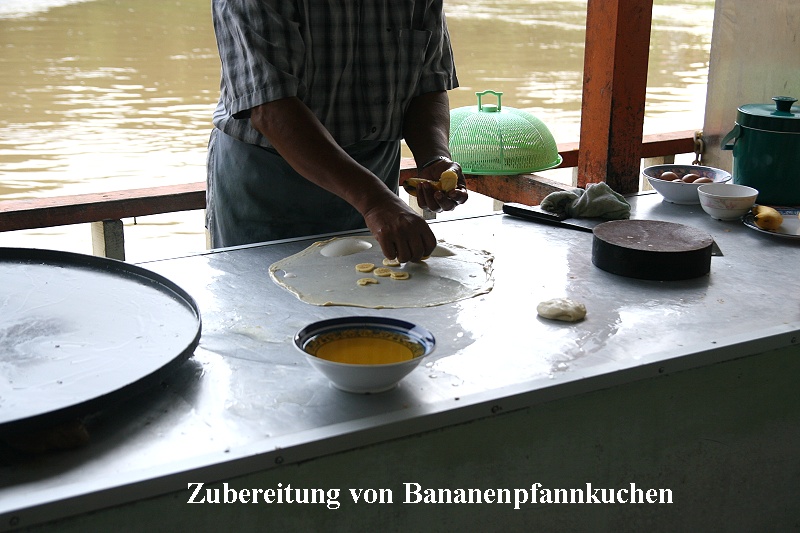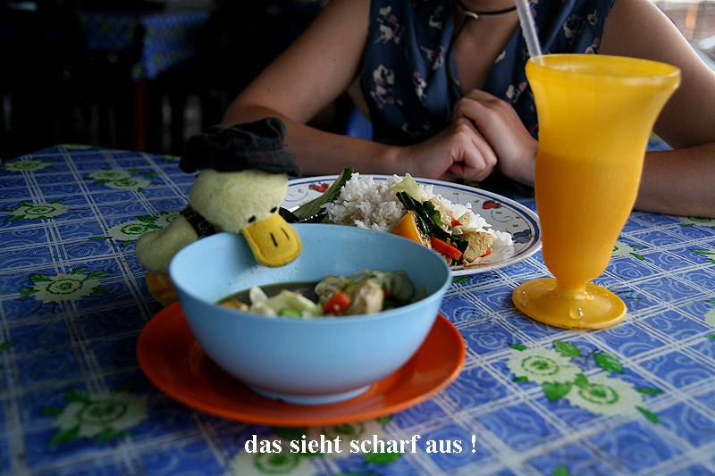 Um 7:00 h war Tomoko schon wach. Ich schlief noch eine halbe Stunde länger. Heute frühstückten wir getrennt. Tomoko und Bärchen wollten unbedingt einen Bananenpfannkuchen am Fluss essen. Also fuhr ich die beiden kurz dorthin, während ich anschließend im Hotel frühstückte. |