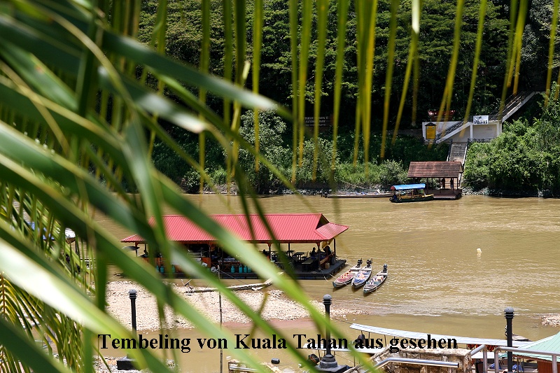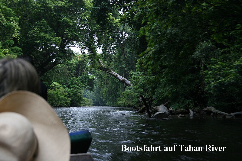Es gab einen leckeren Bananenpfannkuchen mit Kaffee. Pünktlich um 8:00 h kam unser Boot. Wir machten es uns bequem und langsam ging es den Tahan-Fluss stromauf. Es lag noch dichter Nebel über dem Dschungel. Der Fluss strömte träge dahin. Die fast schwarze Farbe des Flusses, dazu die Stimmen und Geräusche aus dem Dschungel, schufen eine gespenstische Atmosphäre. |