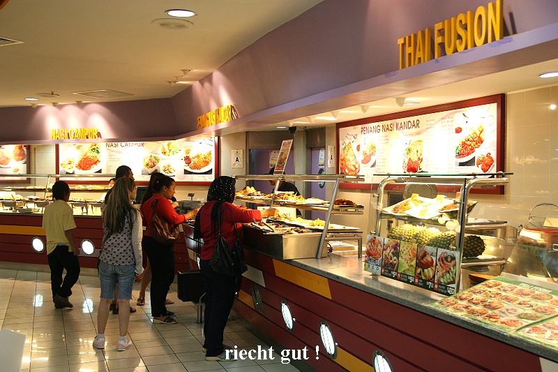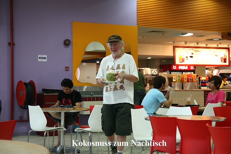 Wir fanden ein Food-Center in der Nähe mit reicher Auswahl an verschiedenen kleinen Essensständen, die wirklich alles anboten, was die verschiedenen asiatischen Küchen zu bieten haben, alles sehr lecker und spottbillig (zwischen 1 und 2 € pro Gericht). Wir kauften anschließend noch eine neue Hose für mich mit zahlreichen Taschen (10 €) und gingen dann durch ein |