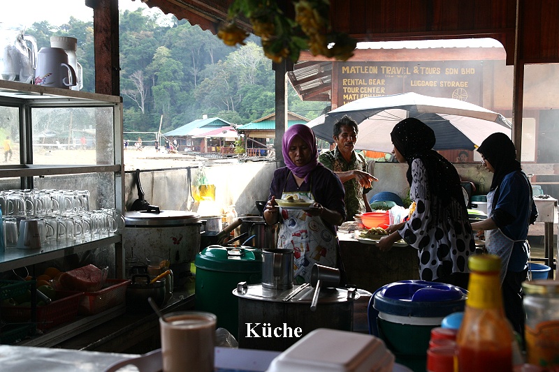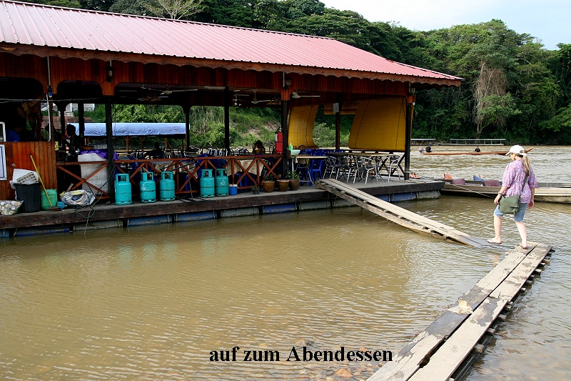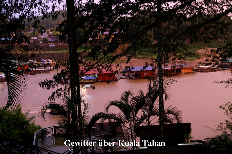 Ich aß ein leckeres Chicken-Curry, Tomoko einen "Tofu-Claypot", beides mit Reis und sehr lecker. Wir fuhren nochmals mit dem Wassertaxi auf die gegenüberliegende Seite und reservierten eine Bootsfahrt am anderen Morgen auf dem Tahan-River. Es wurde dunkel und am Himmel zuckten wieder Blitze, die aber diesmal weit weg blieben. In unserer jetzt wieder angenehm kühlen Junior-Suite angekommen duschten wir, tranken ein Bier auf der Terrasse und schrieben noch etwas Tagebuch. Nach der unruhigen vorhergehenden Nacht gingen wir dann früh um 21:45 h schlafen. |