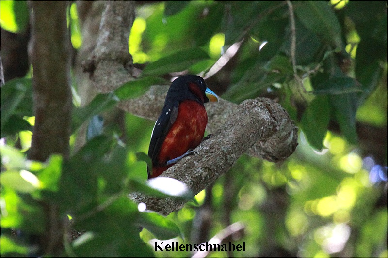 Nicht ganz ausgeschlafen wurden wir gegen 7:15 h wach, duschten und gingen zum Frühstück. Strom war immer noch nicht da, trotzdem gab es Omelette, Kaffee und weiches Toastbrot. Um 9:00 h waren wir auf der anderen Seite des Flusses und machten uns auf den Weg, den uns Keith am Abend vorher skizziert hatte. Wir wanderten zwischen den Bungalows des Mutiara-Resorts nach Osten. Hier konnten wir einen Rosenkopf-Breitrachen (Banded Broadbill) sehen. |