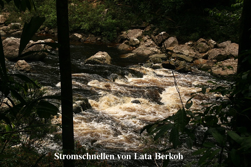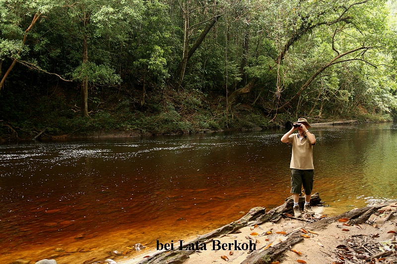 Es war noch angenehm kühl. Hin und wieder passierten wir Stromschnellen, über die unser Kapitän geschickt hinweg manövrierte. Auf der Spitze des Bootes saß ein weiterer Malaie, der mit einem Paddel half, den Kurs zu halten. Wir fuhren etwa 10 km stromauf bis zu einer Stelle, wo dicke Felsen im Fluss ein Weiterfahren unmöglich machten. Auf der Fahrt hierher sahen wir mehrere Hornbills in großer Höhe (40-50m) die Baumwipfel kreuzen. Wir konnten leider nicht bestimmen, um welche Art es sich handelte. |