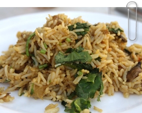 Wenn die Flüssigkeit verdunstet ist, den Reis und Eier reinmischen und noch ein Paar Minuten gut braten. Mit Koriander garnieren.
